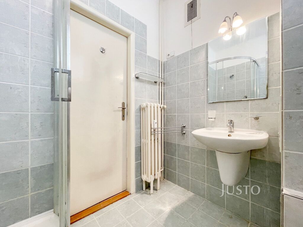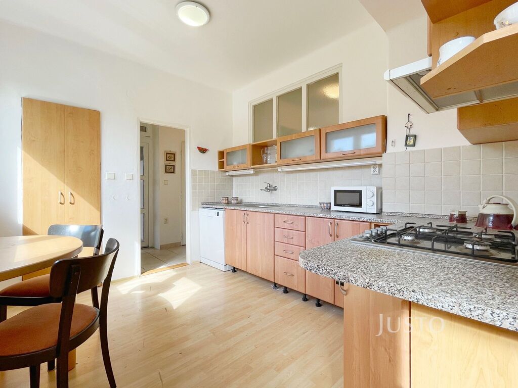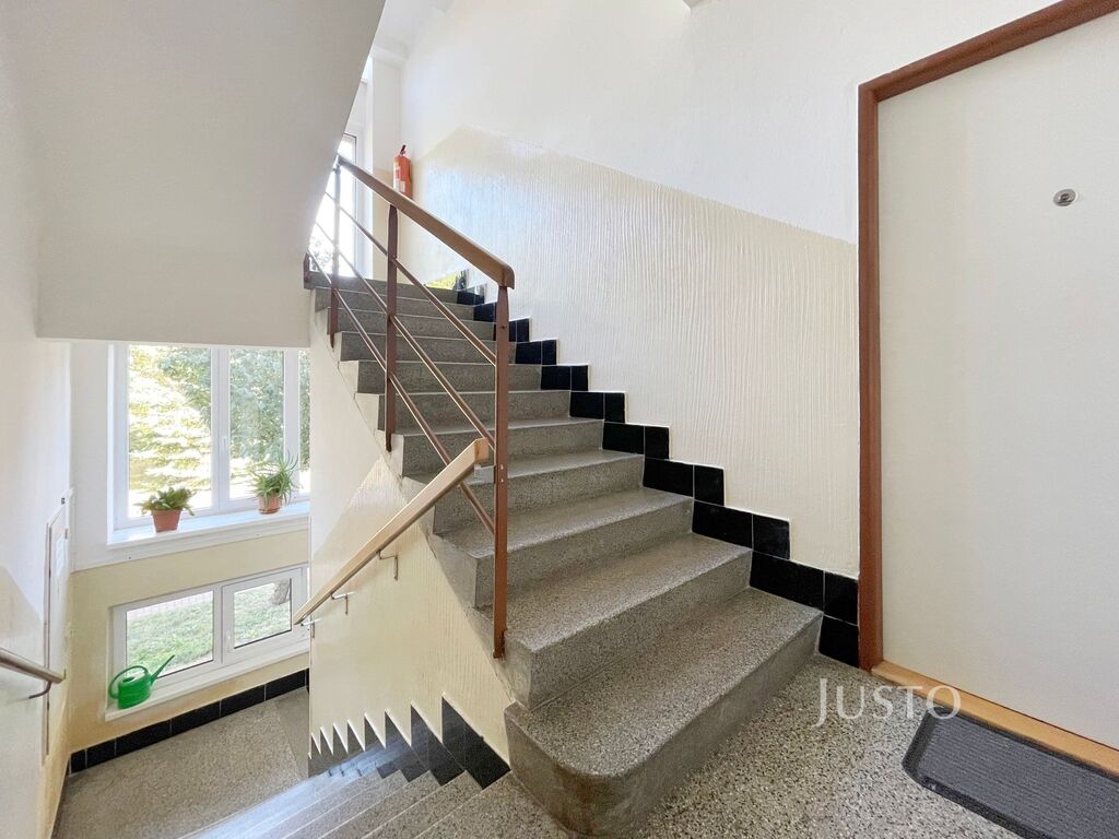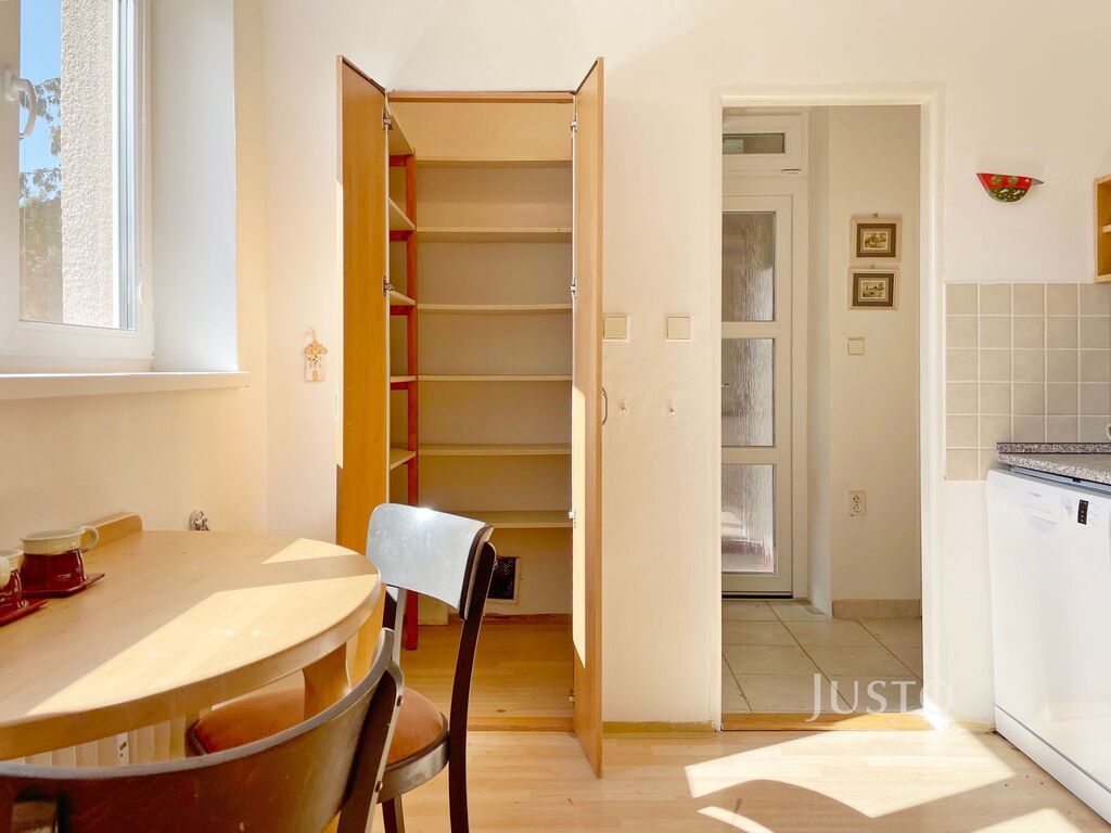 Dominantou bytu je světlý a vzdušný obývací pokoj s jídelním koutem, který plynule navazuje na kuchyň s dostatkem úložných prostor. Z oken je příjemný výhled do zeleně, což poskytuje dostatek klidu a soukromí.