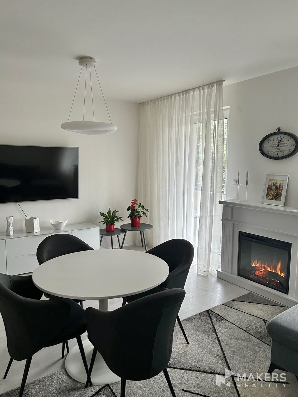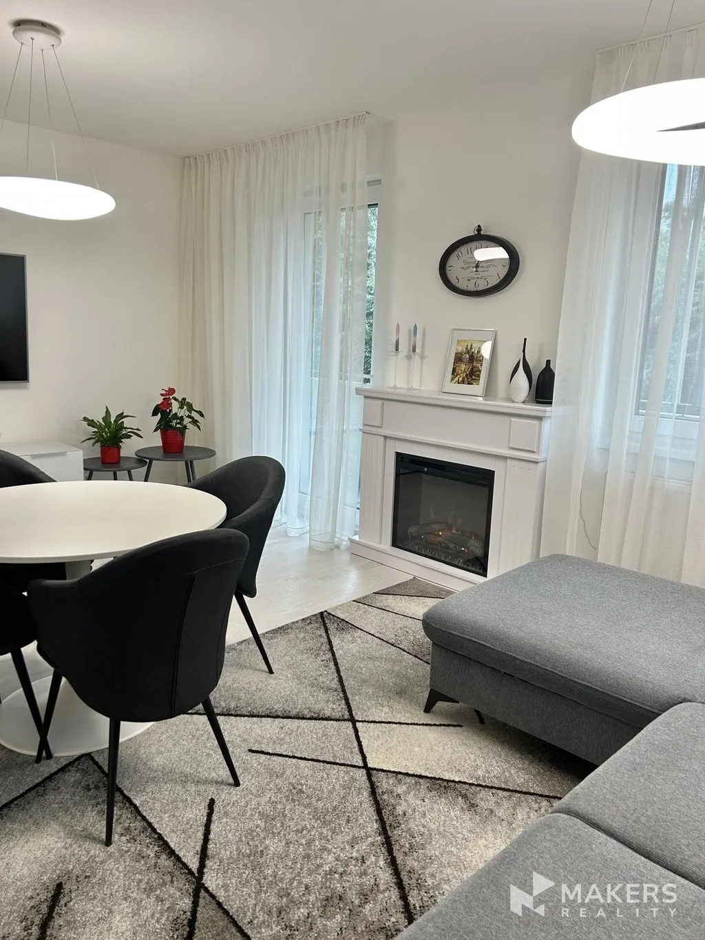 Interiér bytu je promyšleně řešený a nabízí vše potřebné pro pohodlné bydlení. Otevřený obytný prostor je vybaven moderní kuchyňskou linkou se spotřebiči – elektrickou troubou, myčkou, varnou deskou, lednicí, rychlovarnou konvicí. Součástí je také jídelní kout se stolem a čtyřmi židlemi, pohodlná rohová rozkládací sedačka, televize a stylový elektrický krb, který interiéru dodává útulnou atmosféru.