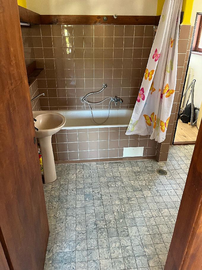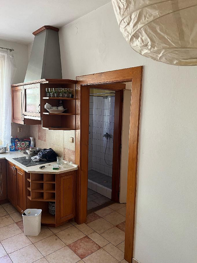 V přízemí domu je kuchyně, velký atypický obývací pokoj, koupelna se sprchou a WC.