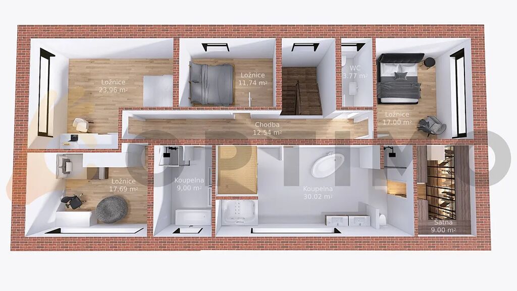 V patře manželská ložnice (17 m2) se šatnou (9,00 m2) a vlastní rozlehlou koupelnou (30,56 m2) disponující saunou, sprchovým koutem, toaletou, vanou a možností osadit vířivku. Dále 2 ložnice (18,03 a 24,05 m2) a hostinský pokoj (11,74 m2). Pokoje mají k dispozici další koupelnu (9,00 m2) s 2 umyvadly, vanou a sprchovým koutem a samostatnou toaletu (3,77 m2).