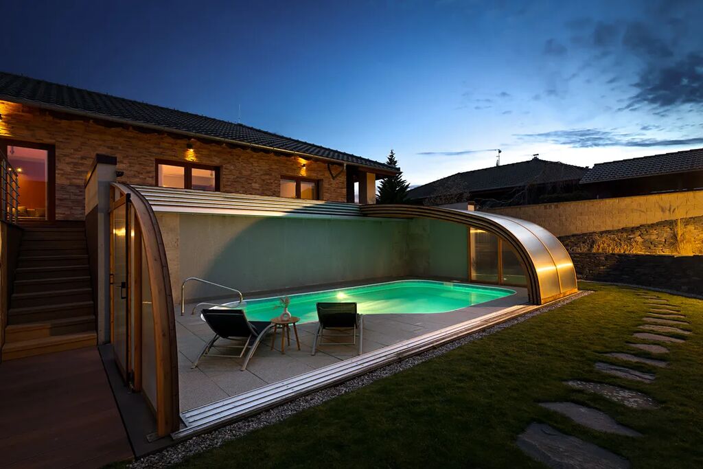 • bazén se slanou vodou, automatickým řízením, ohřevem a elegantním hliníkovým zastřešením Alukov, které lze snadno otevřít pro maximální užitek z letních dnů