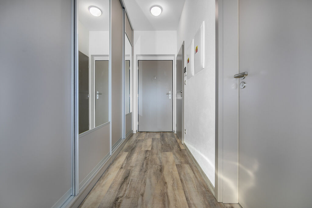 Byt kuchyňskou linkou se spotřebiči od zn. Elektrolux, roletami ve všech oknech a vestavěnou skříní na míru v předsíni.