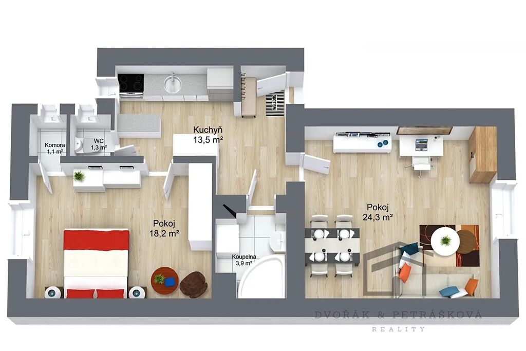 Byt s podlahovou plochou 62 m2 se nachází v prvním nadzemním podlaží a disponuje předsíní, na kterou navazuje kuchyňský kout s oknem do klidného dvora, samostatnými vstupy do obou pokojů (obývacího pokoje a ložnice), do koupelny a na toaletu. Obývací pokoj (25 m2) s dřevěnou podlahou a vysokými stropy je orientovaný do ulice, ložnice (19 m2) je umístěna separátně s okny do dvora a se vstupem do komory - ta vám může posloužit jako menší šatna. Kuchyňský kout (8,6 m2) je vybavený myčkou na nádobí, lednicí s mrazákem, elektrickou horkovzdušnou troubou, mikrovlnou troubou, plynovým sporákem a dostatkem úložného prostoru. Koupelna s vanou a pračkou je umístěna od toalety separátně. Okna jsou špaletová s dvojitým rámem (vnějším a vnitřním). Vytápění bytu a ohřev vody zajišťuje plynový kotel se zásobníkem na vodu. Byt je dle prohlášení vlastníka klasifikován jako 2+kk, současná dispozice je však 2+1.