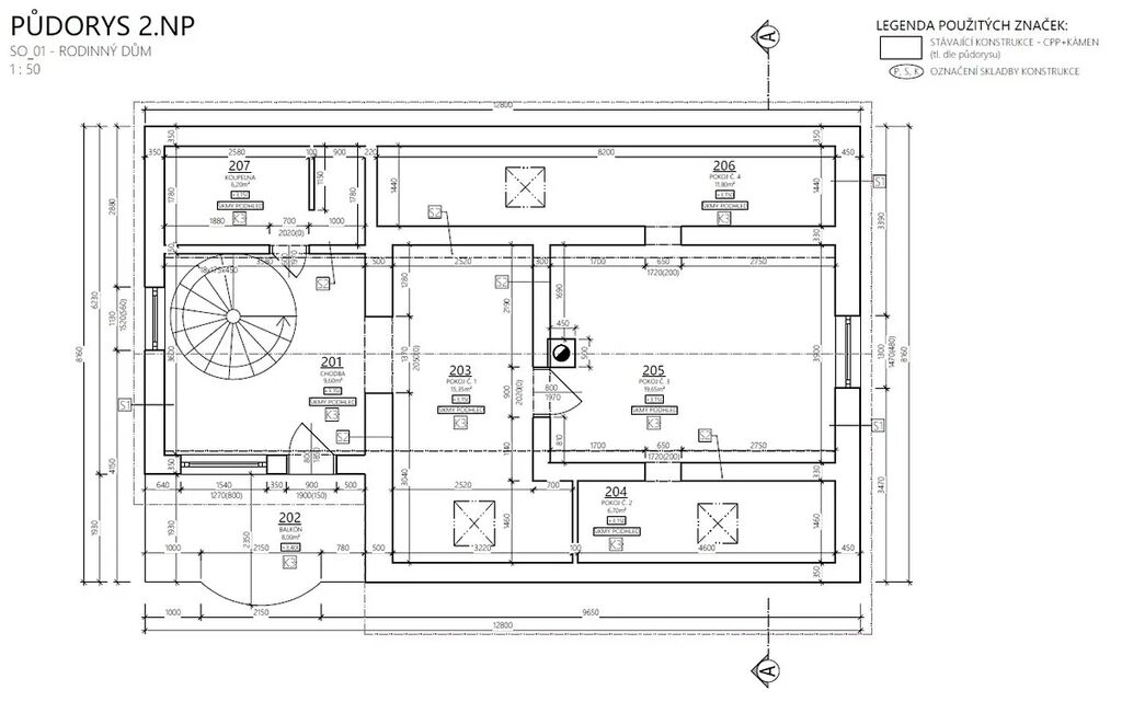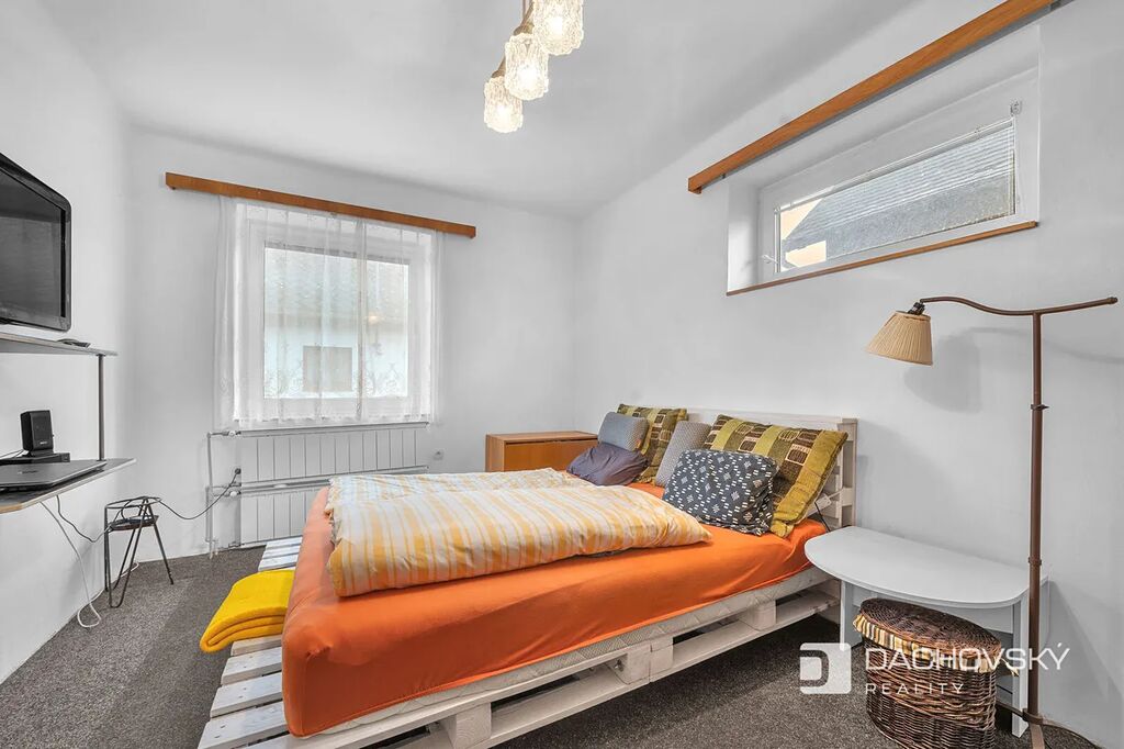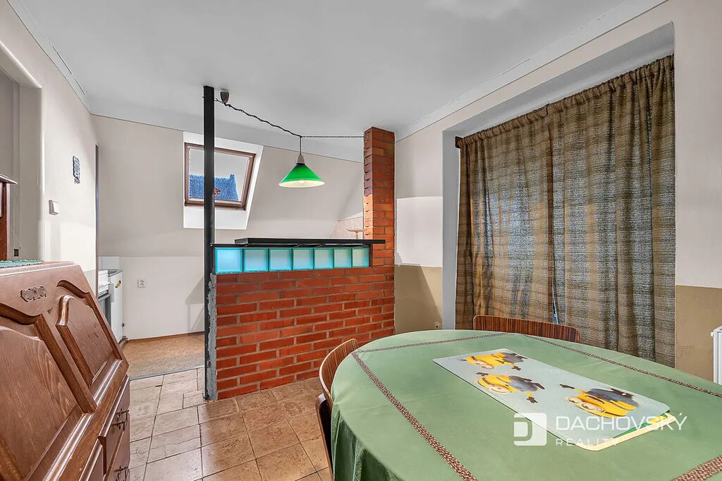 Podkroví (cca 77 m²): kuchyňský kout, obývací pokoj, 2 menší místnosti (ložnice/úložné prostory), koupelna s WC, terasa (8 m²).