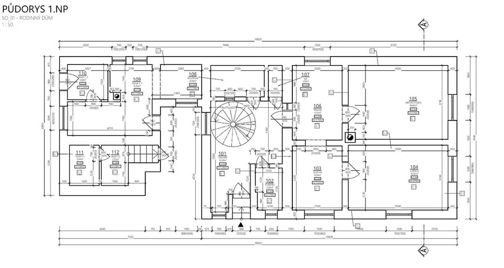 Přízemí (cca 75 m²): kuchyň s jídelním koutem, 2 pokoje, koupelna, WC, prostorné zádveří se schodištěm.