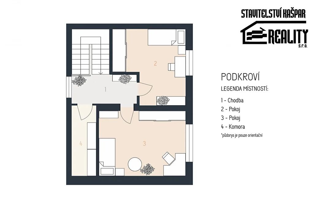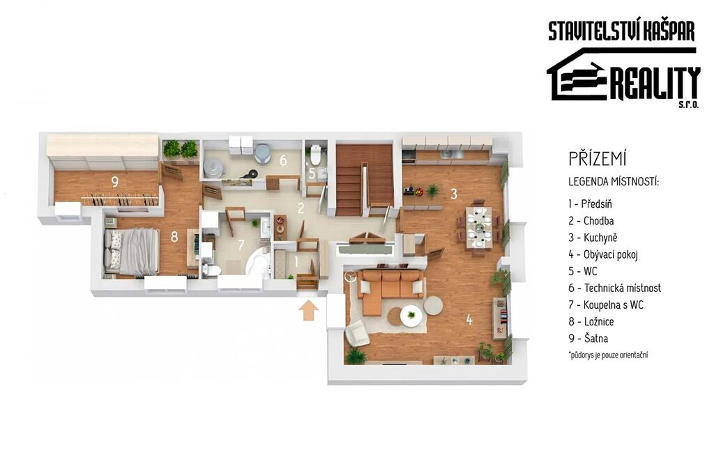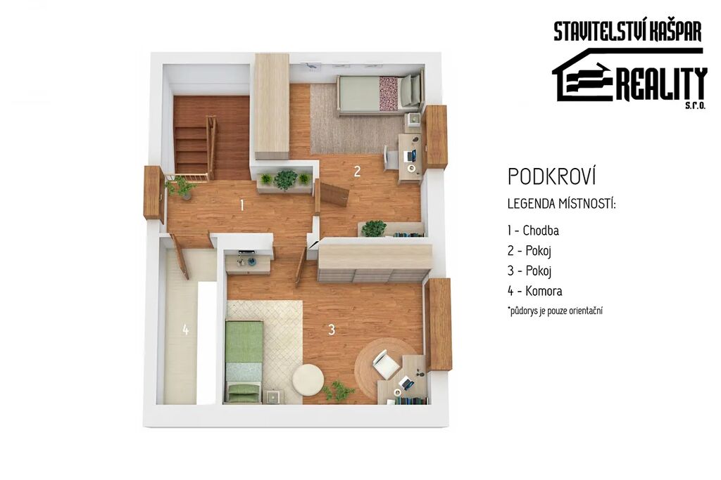 V přízemí dále najdete koupelnu s WC, samostatné WC, technickou místnost a ložnici se šatnou. Pod schodištěm je vstup do podsklepené části, která slouží jako další úložný prostor. V podkroví se nachází dva dětské pokoje a úložná místnost. K domu patří samostatně stojící garáž, sklad a pergola vhodná pro letní posezení.
