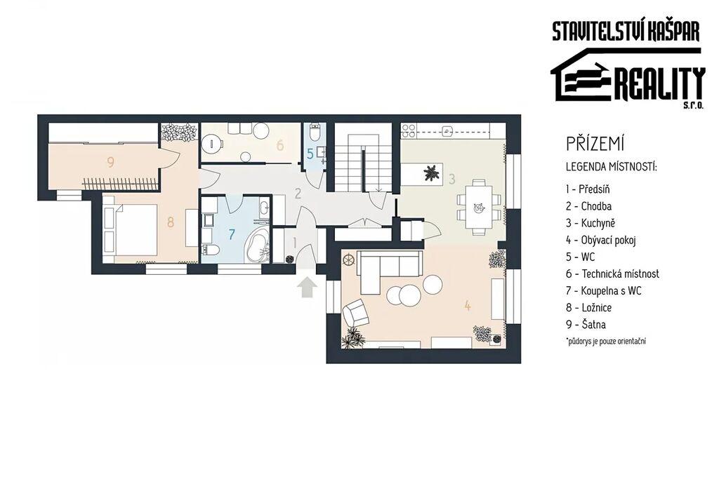 Po vstupu do domu vás přivítá zádveří a propojovací chodba, ze které se dostanete do prostorné kuchyně spojené s obývacím pokojem srdce celého domu.