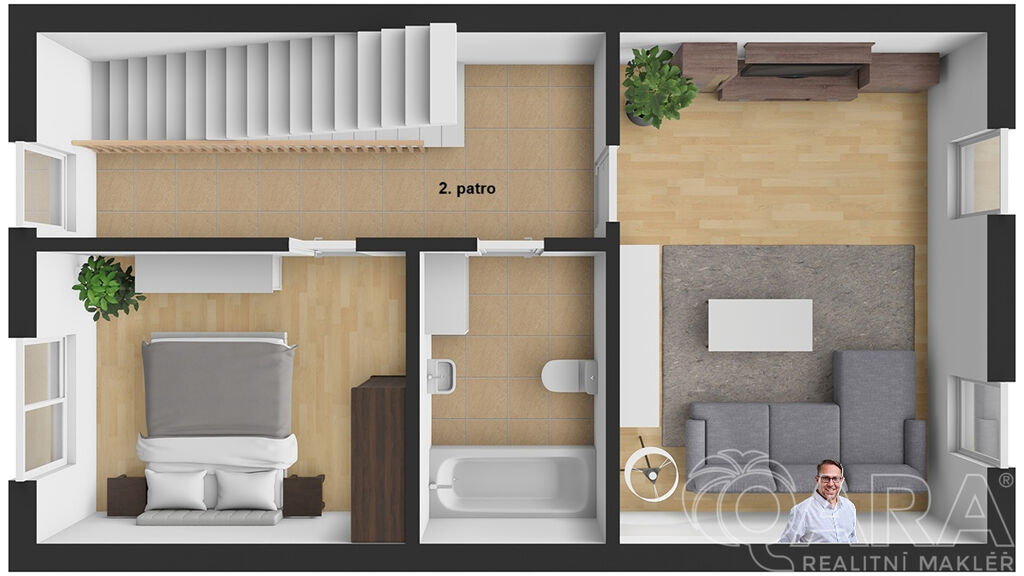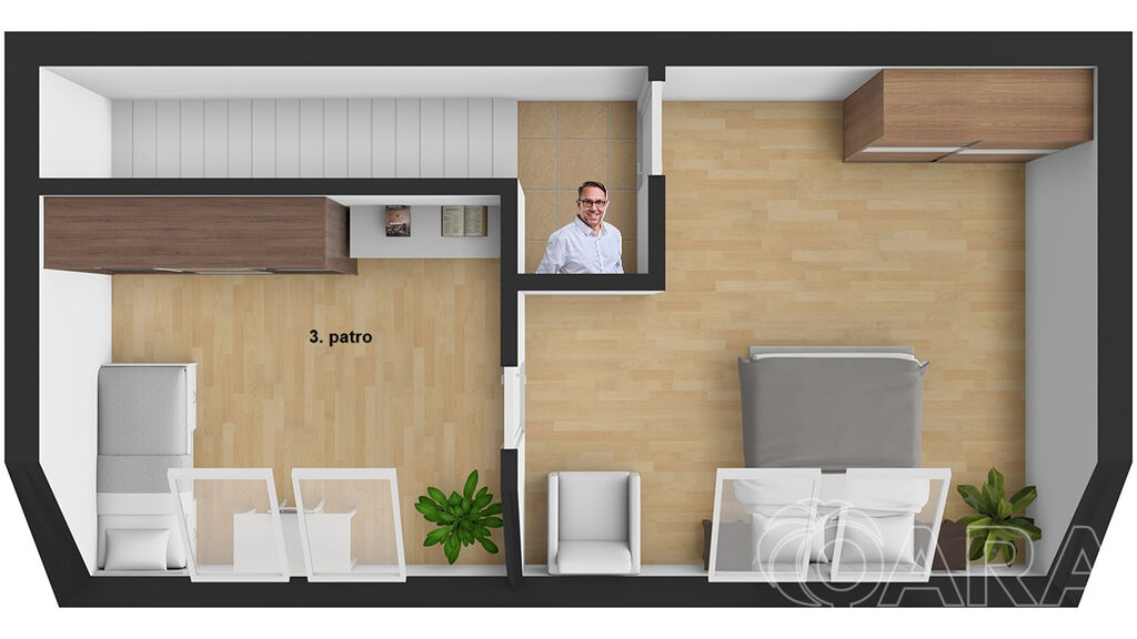 • 3. patro: Dva podkrovní pokoje (22 m2 a 13 m2) se střešními okny, které zajišťují dostatek denního světla.