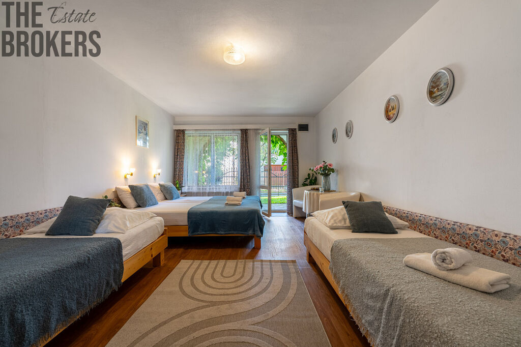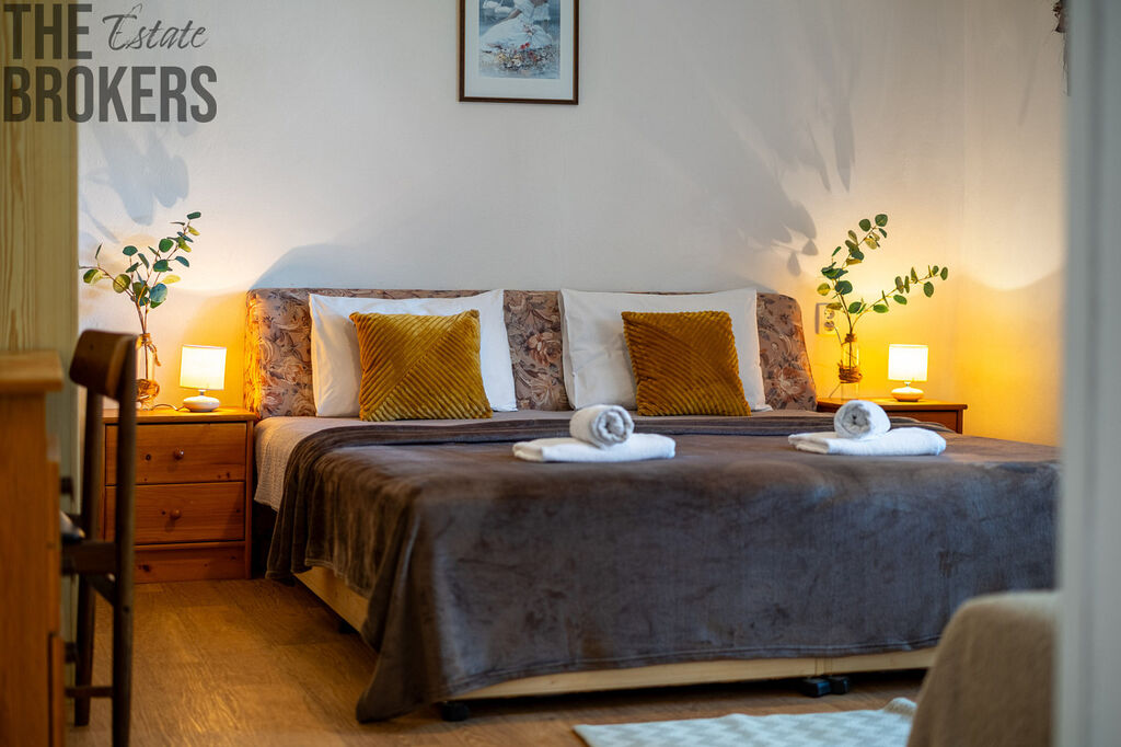 Dům je navržen tak, aby nabídl budoucím majitelům plnohodnotné bydlení v prvním patře, kde se snoubí pohodlí s atmosférou domova. K příjemným benefitům patří terasa o velikosti 28 m², která vybízí k posezení s rodinou a přáteli. Přízemí domu je přizpůsobeno k provozu krátkodobých pronájmů apartmánového typu. Každý apartmán má svou koupelnu a toaletu, což zajišťuje soukromí a komfort pro hosty. Celková kapacita ubytování činí 16 lůžek, přičemž tato část domu je již využívána a k prodeji bude předán i seznam stálé klientely. Nový majitel tak může okamžitě navázat na zavedený provoz.