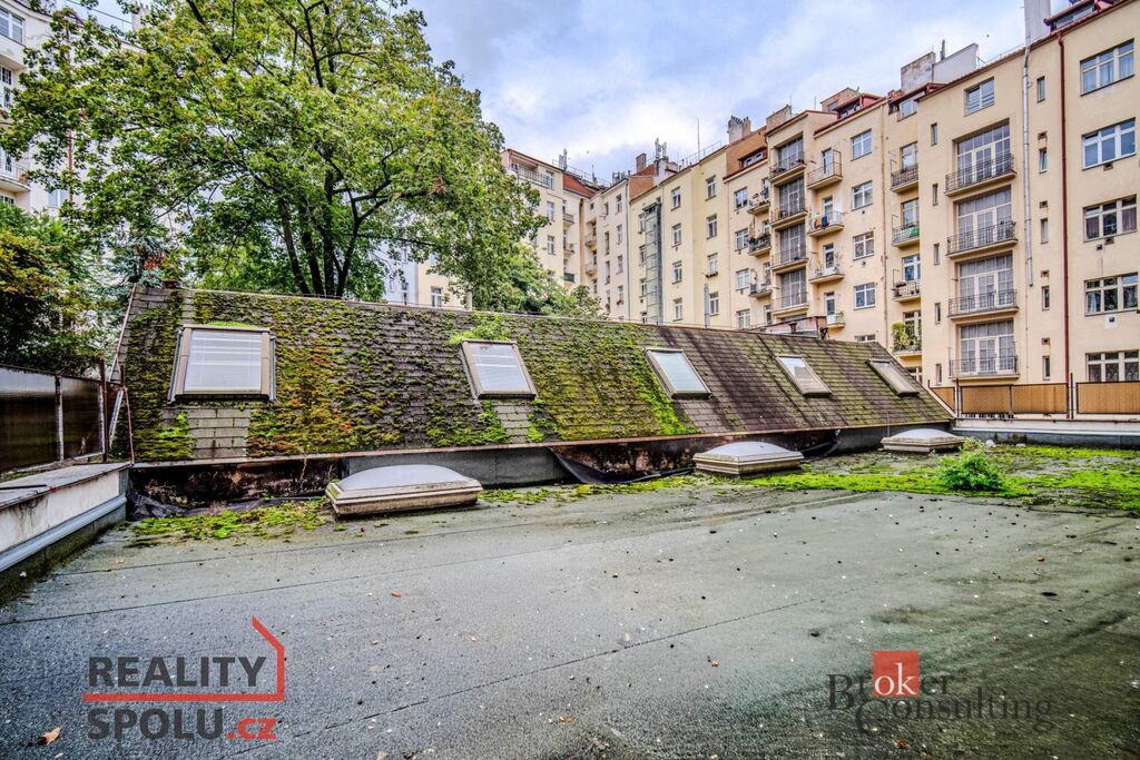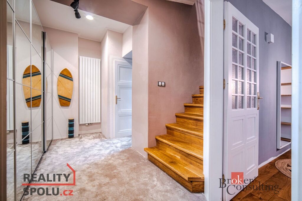 Z obývacího pokoje vede schodiště do spodního patra, kde se nachází chodba s vestavěnými skříněmi, menší pokoj vhodný jako šatna či pracovna, dále dětský pokoj a ložnice se vstupem na střechu. Celý byt je orientovaný do klidného vnitrobloku, což zajišťuje dostatek soukromí a příjemnou atmosféru i uprostřed města.