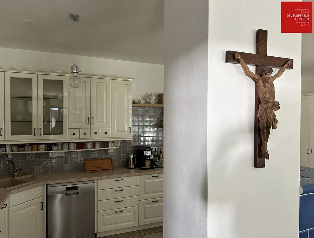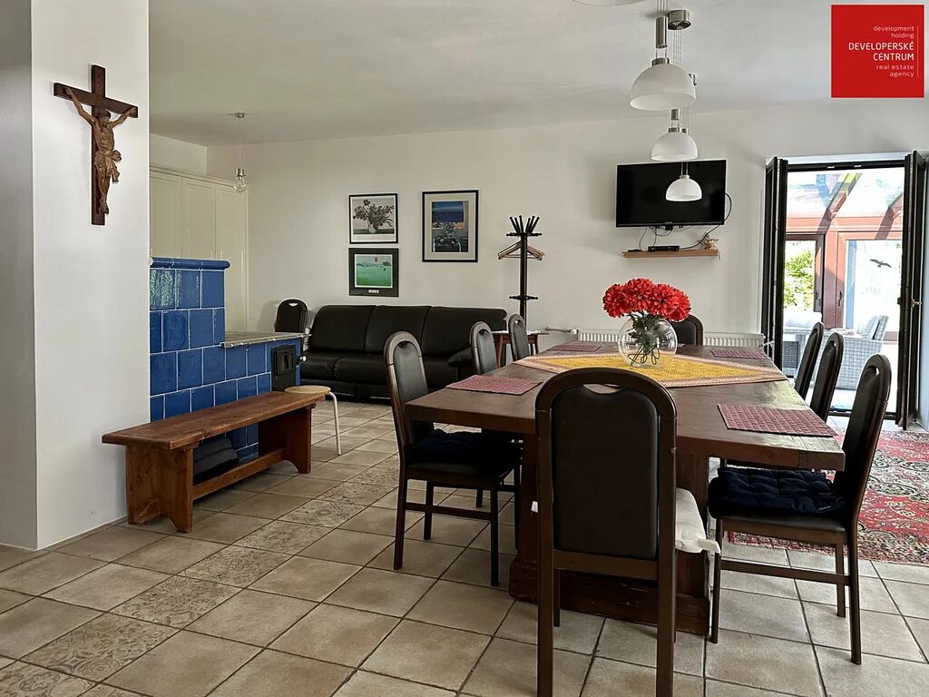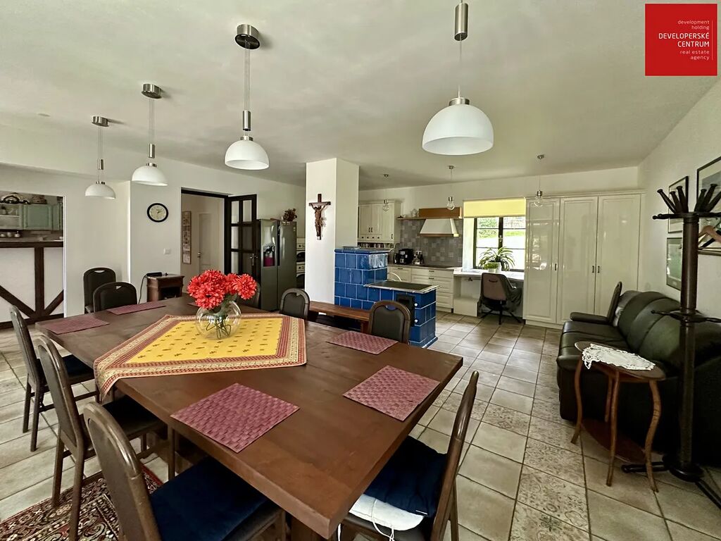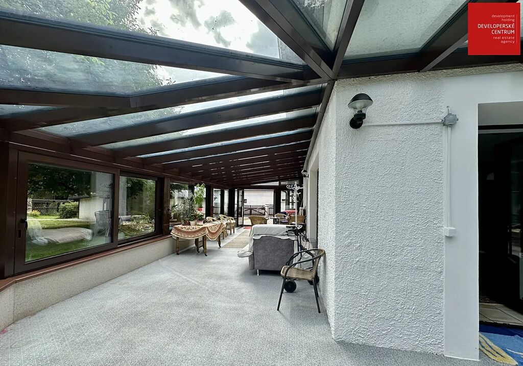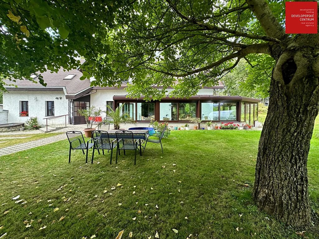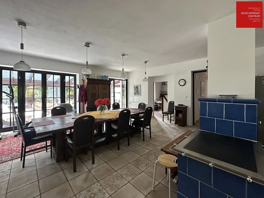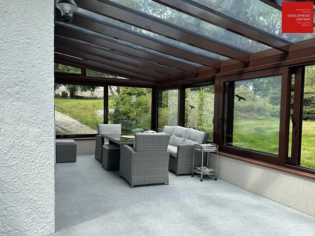 Hlavní dominantou je prostorný rodinný dům s obytnou plochou téměř 365 m², který byl v 90. letech kompletně zrekonstruován a v posledních letech dále modernizován. Dům nabízí komfortní dispozici s velkou kuchyní, jídelnou s kachlovými kamny, obývacím pokojem se vstupem do zimní zahrady a několika ložnicemi i koupelnami. V podkroví jsou apartmánově řešené prostory s vlastními kuchyňkami a koupelnami, které se skvěle hodí pro vícegenerační bydlení nebo ubytování hostů. Výjimečným prvkem je prostorná zimní zahrada o rozloze 53 m², postavená v letech 2019–2021 v systému Hobbytec Aluminium, vybavená izolačním trojsklem a kompletním vytápěním. Moderní komfort zajišťuje tepelné čerpadlo IVT Greenline E14 HE z roku 2016, doplněné o fotovoltaický systém instalovaný na střeše garáží.