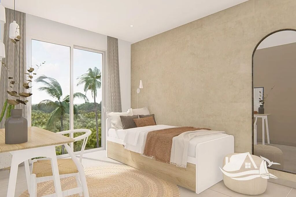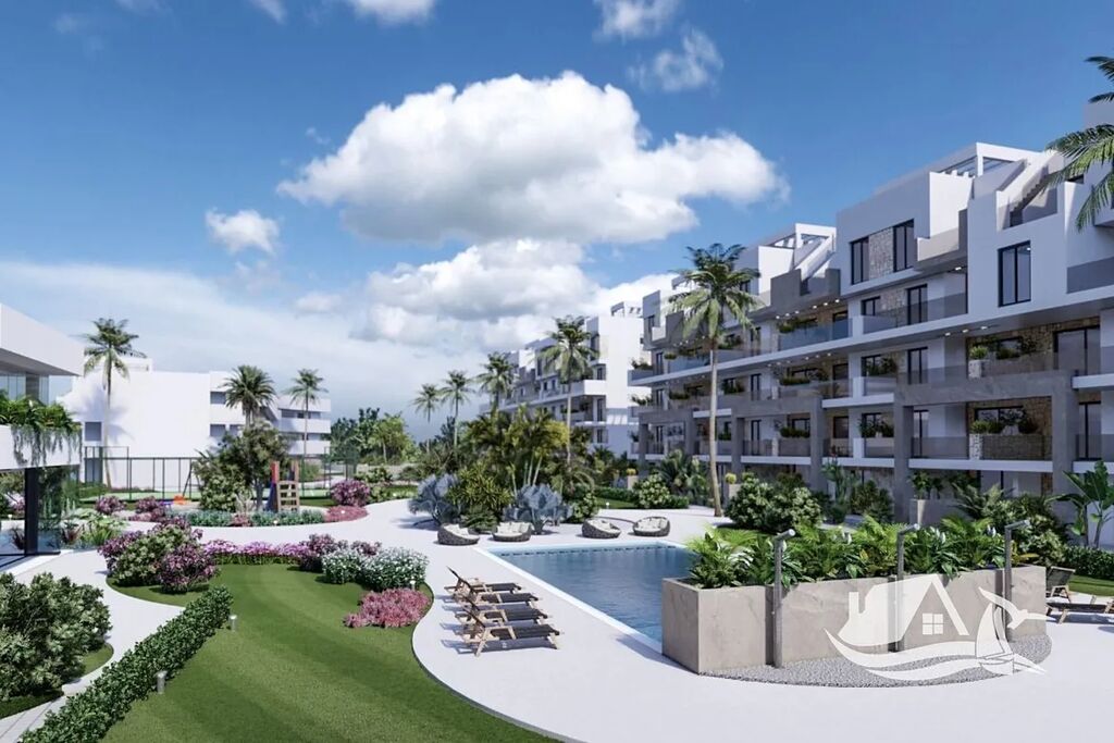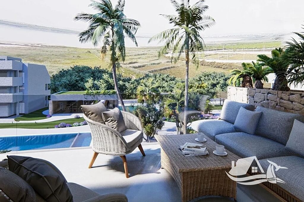 Tento elegantní apartmán o dispozici 3+kk a celkové ploše 75 m² nabízí pohodlí pro celoroční bydlení i rekreaci. Jeho dominantou je prostorná terasa o velikosti 19 m², odkud se otevírá uklidňující pohled na zeleň a solné laguny La Mata. Interiér je navržen v minimalistickém stylu s důrazem na vzdušnost a přirozené světlo. Otevřený obývací prostor s kuchyňským koutem tvoří přirozené centrum bytu, které doplňují dvě ložnice a dvě koupelny.
