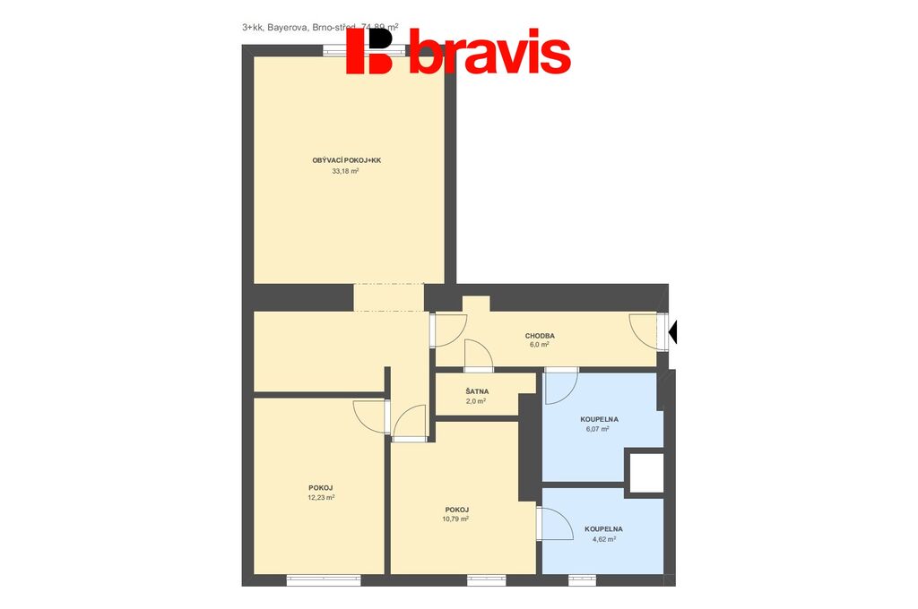Ve výhradním zastoupení majitele nabízíme ke koupi prostorný a velmi příjemný byt o dispozici 3+kk o celkové ploše 75 m², který se nachází ve 3. patře cihlového domu s výtahem na vyhledávané adrese Bayerova ulice, jen pár minut chůze od samotného centra Brna.