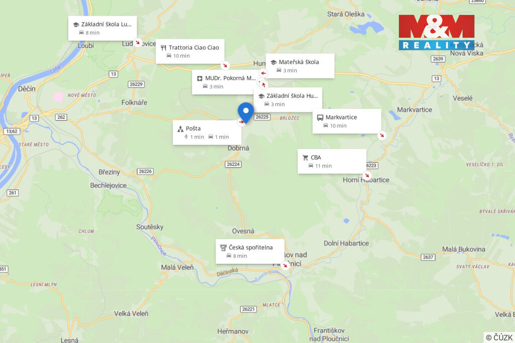 Stavební pozemek o výměře 779 m² se nachází v malebné obci Dobrná, jen 10 minut jízdy od Děčína. Dle územního plánu je určen k výstavbě rodinného domu. Elektřina na pozemku momentálně není, ale připojení je bez komplikací. Voda bude zajištěna věcným břemenem z vrtu na sousedním pozemku, odpad povede do čističky přes pískovou filtraci. Přístupová cesta bude před prodejem převedena do vlastnictví obce. Veškerá občanská vybavenost – škola, školka, obchod, služby i lékař – je snadno dostupná v Děčíně. Výhodou je také výborné napojení na dálnici D8 (cca 15 minut) a blízkost hranic s Německem (do 25 minut jízdy).