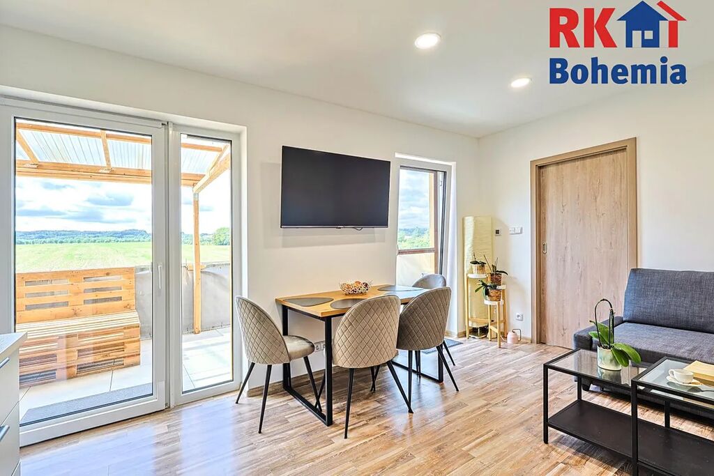 Z kuchyně i z pokoje se vchází na prostornou terasu skýtající klidný a krásný výhled do okolní zeleně. Ideální místo pro ranní kávu nebo večerní grilování.