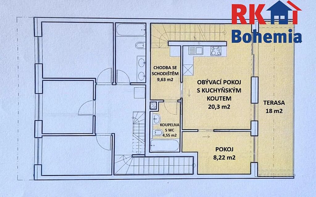 Byt je mezonetový a skládá se ze 3 podlaží. V 1.NP se nachází společná chodba, zádveří a schodiště do 2.NP. Ve 2.NP je obývací pokoj s kuchyňským koutem (20,3 m2), pokoj (8,22 m2), koupelna s WC (4,55 m2) a chodba se schodištěm (9,63 m2) do 3.NP, kde se nachází otevřený podkrovní pokoj (29,39 m2). Tento pokoj nabízí flexibilní využití (pracovna, herna, posilovna, relaxační místnost apod.).