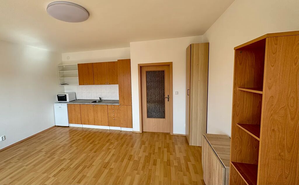 Za vstupem do bytu najdete prostornou předsíň s vchodem do koupelny se sprchovým koutem a WC a vstup do pokoje s kuchyňskou linkou a balkonem.
