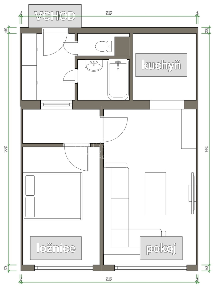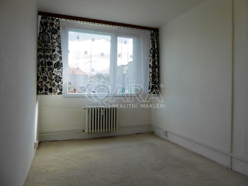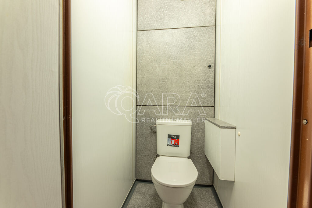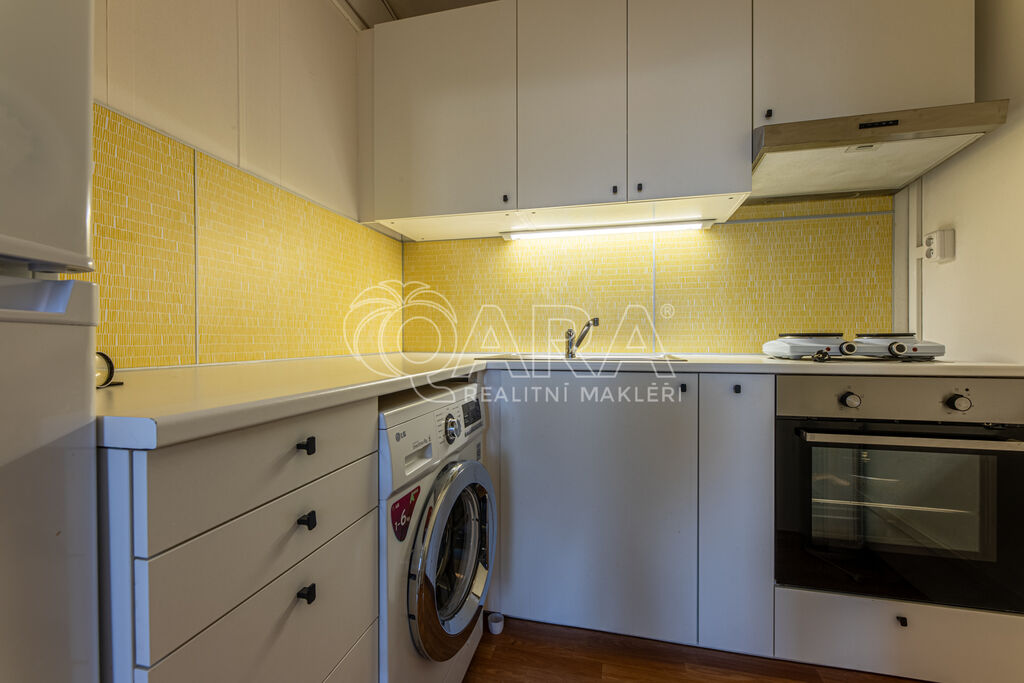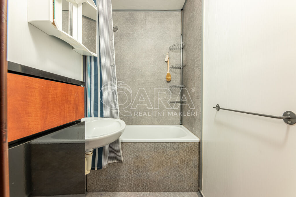 Prostorná chodba, ze které je přístup na toaletu a do koupelny s vanou. Samostatní ložnice nabízí i dostatek místa pro úložné prostory. Obývací pokoj je spojen s kuchyňským koutem, kde je vybavená linka. K bytu náleží sklepní kóje.