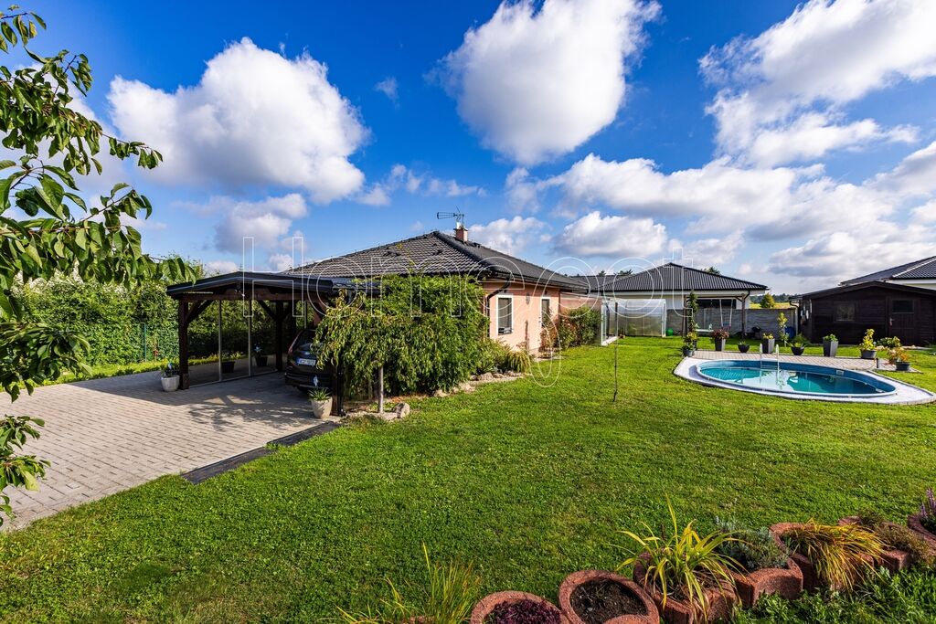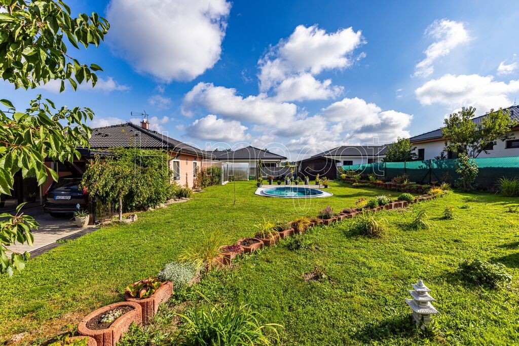 Pozemek o celkové výměře 911 m² je skutečnou oázou klidu. Zahrada (824 m²) není jen trávník, ale živý prostor pro relaxaci i zábavu. Nabízí bazén pro letní osvěžení, skleník pro vášnivé pěstitele a zahradní domek, který skvěle poslouží jako dílna pro kreativní práci nebo sklad nářadí. Kryté parkovací stání pro dvě auta chrání vaše vozy a je elegantně zakomponováno tak, aby nerušilo výhled.