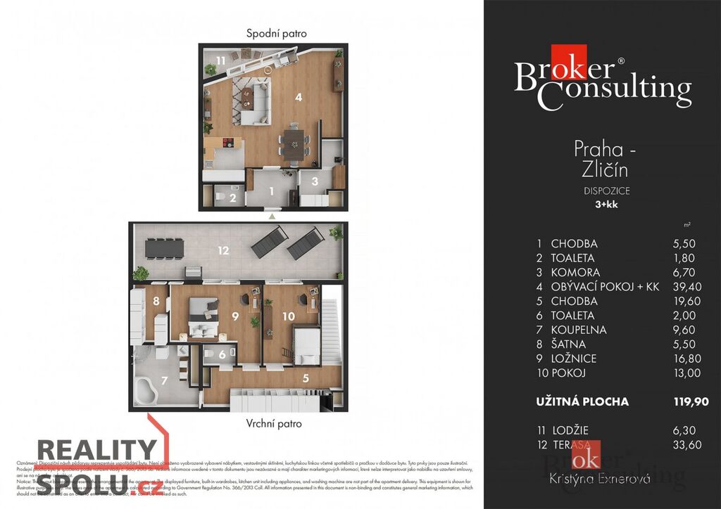 Nabízíme k prodeji slunný dvoupatrový byt 3+kk o velikosti 120m2 s terasou a garáží. Jednou z hlavních předností bytu je velká terasa s výhledem do okolí, která poskytuje soukromí a prostor pro odpočinek nebo grilování. Součástí bytu je také zasklená lodžie, kterou lze využívat jako zimní zahradu. Byt nabízí mnoho úložných prostor, každý pokoj je vybaven klimatizací, dvěma toaletami a elekrickými venkovními roletami. Bytový dům využívá sdílené solární panely, které snižují provozní náklady na společné prostory v domě.