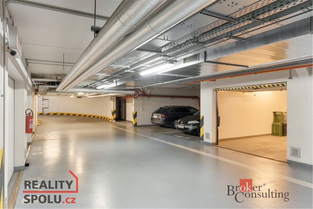 K bytu dále náleží uzavřené garážové stání a dva sklepy, které zajišťují dostatek úložného i parkovacího komfortu.