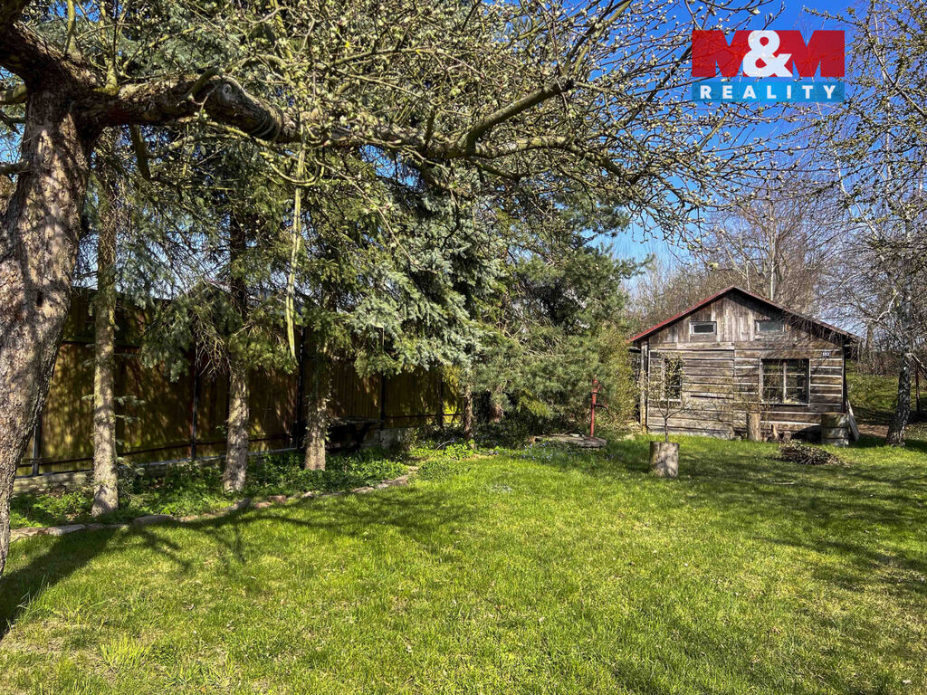 Součástí pozemku je zděná stavba (42 m²), která slouží jako víkendový domek s dřevěným patrem, zavedenou vodou a vytápěním kamny – ideální jako dočasné bydlení během stavby či jako rekreační objekt. Nechybí ani praktický dřevěný domek pro uskladnění materiálu v zadní části a malá kůlna.