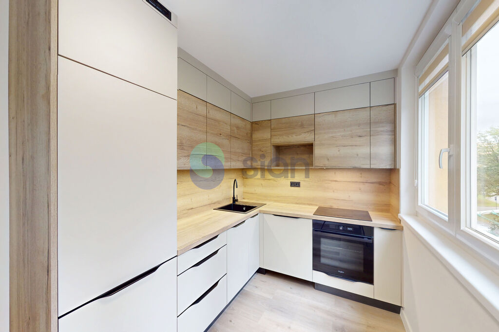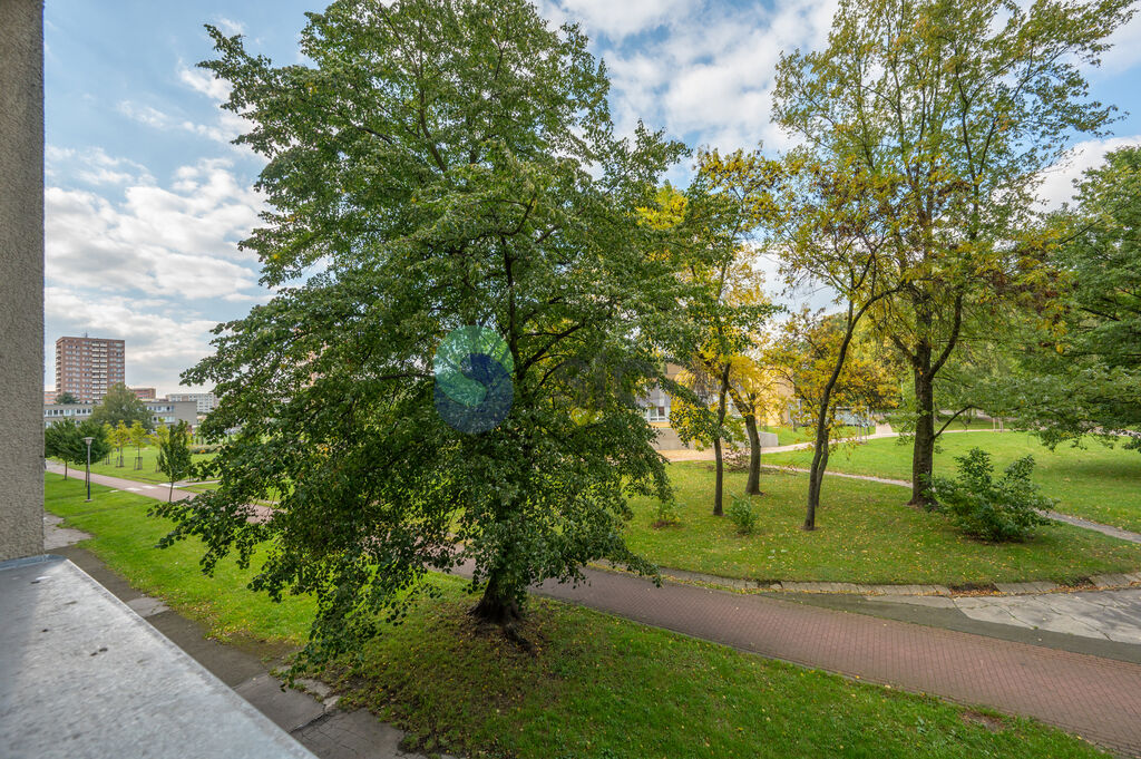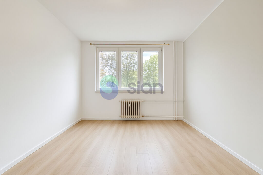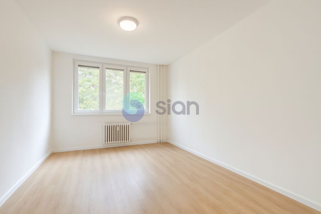 Díky oknům orientovaným na obě světové strany je byt světlý a nabízí příjemný výhled do zeleně.