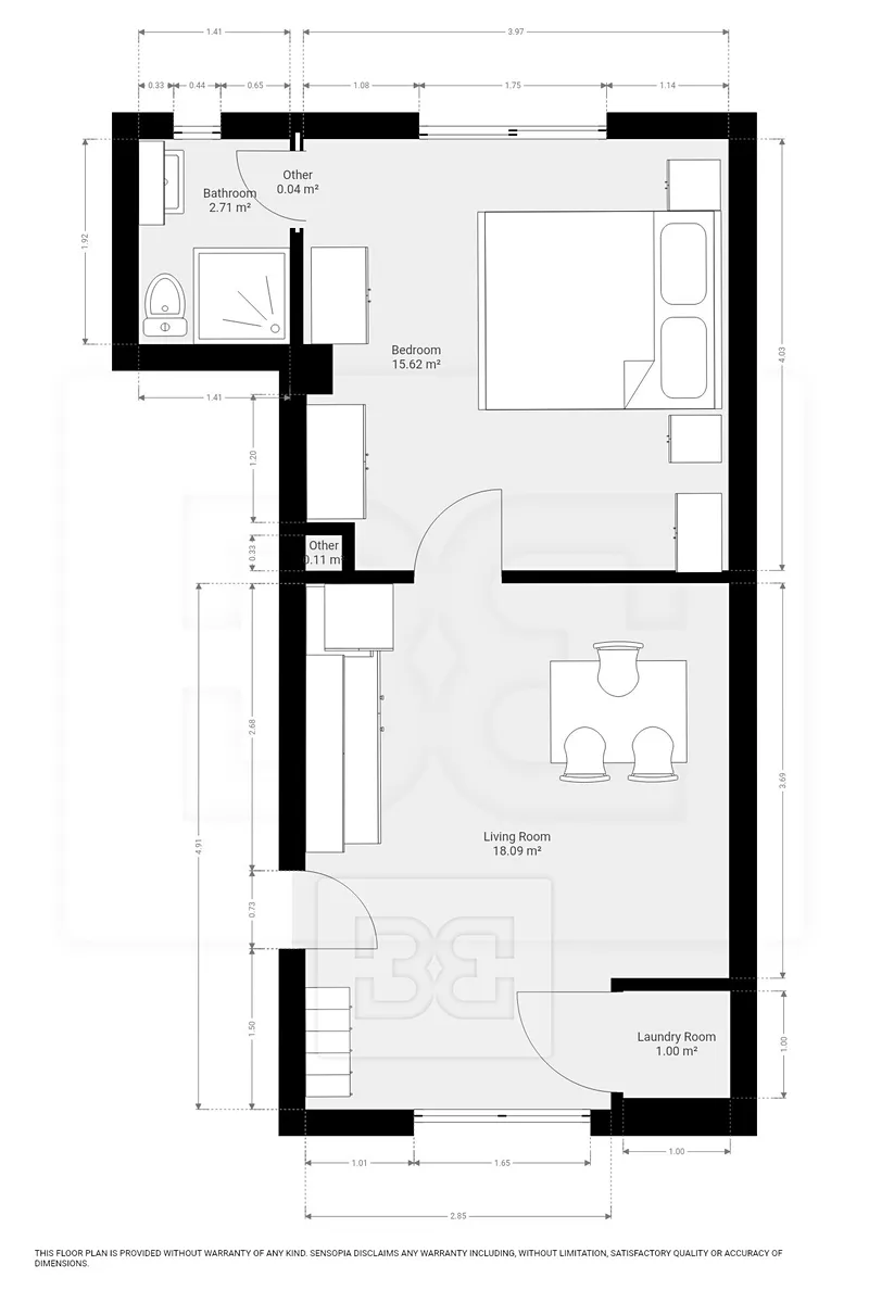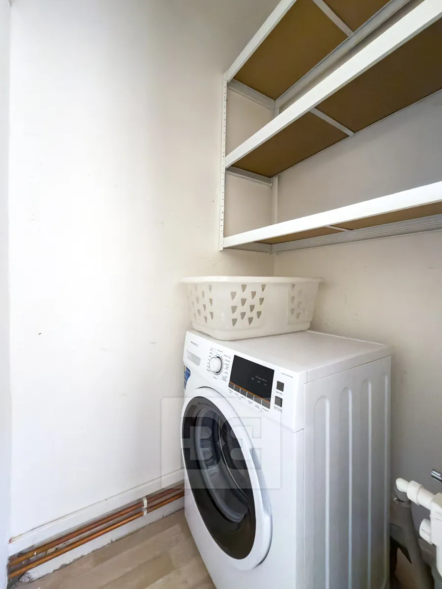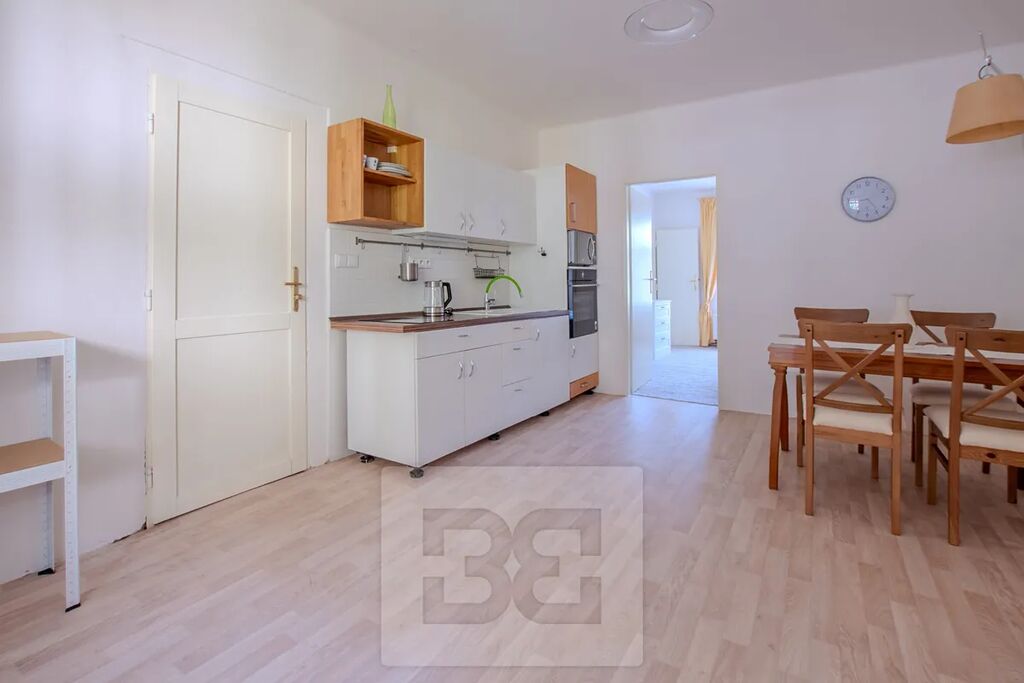 Byt je částečně vybavený a tvoří jej obývací pokoj spojený s kuchyňským koutem, vybaveným kuchyňskou linkou se spotřebiči (trouba, lednice, mrazák). V obývací části je k dispozici jídelní stůl se židlemi. Součástí bytu je také menší komora s úložným prostorem a pračkou.