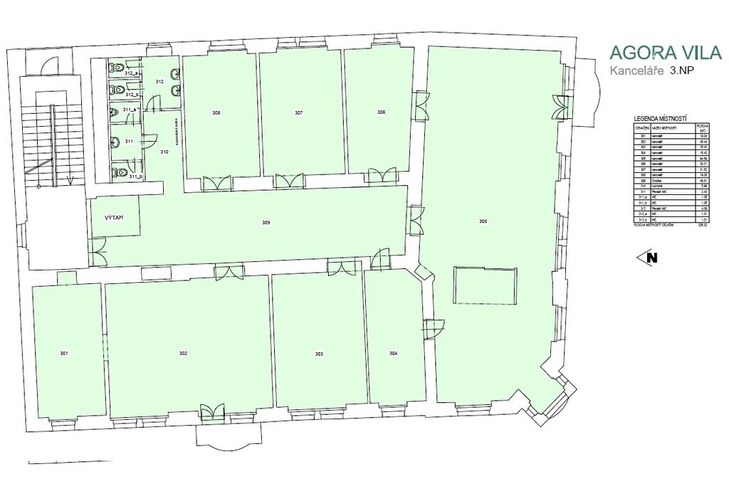 Vila, která je součástí komplexu AGORA FLORA nabízí celkem čtyři nadzemní podlaží, přičemž nabízený nebytový prostor o výměře 325,35 m2 se nachází ve 3.NP. Prostory jsou svým charakterem vhodné pro využití jako kanceláře, případně po rekolaudaci i jako ordinace lékařů.