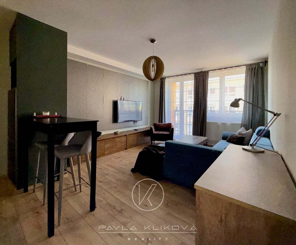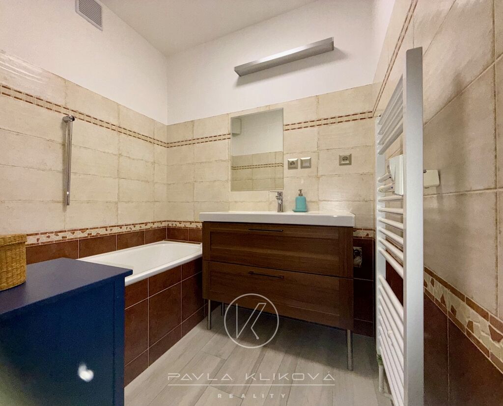 Byt tvoří chodba s vestavnými skříněmi, ložnice s manželsou postelí, komodou a knihovnou. Obývací pokoj je vybavený sedací soupravou, konf.stolkem, kobercem, televizí a TV skříňkou. Obývák navazuje na kuchyňský kout, který má myčku nádobí, varnou desku, el.troubu, digestoř a lednici s mrazákem a jídelní stůl. Koupelna s vanou a koupelnovým nábytkem. WC samostatné. Byt je volný ihned. Nájem 17 000 Kč/měsíc, poplatky 2 500 Kč/měsíc včetně elektřiny, kauce 34 000 Kč, provize 21 000 Kč včetně DPH.