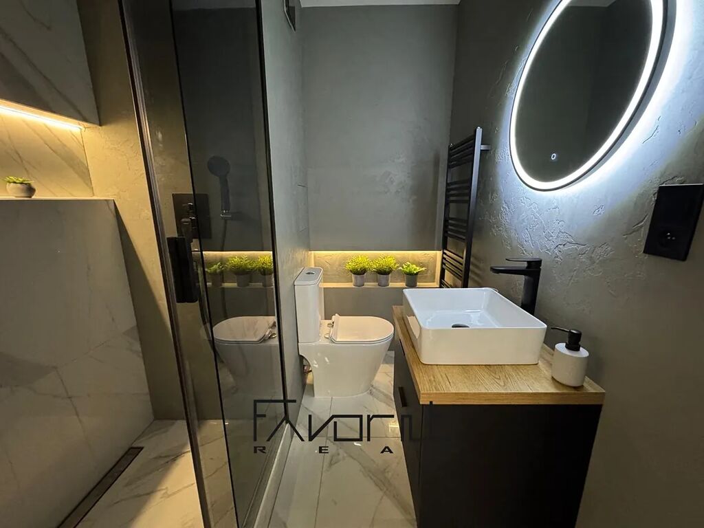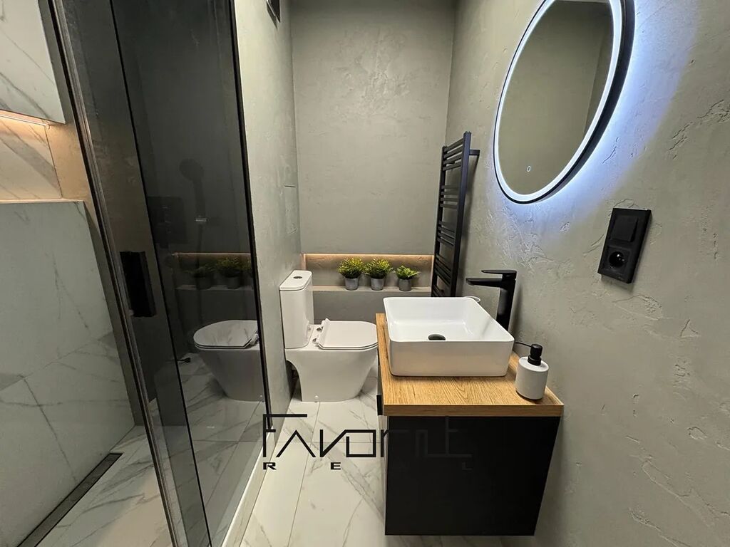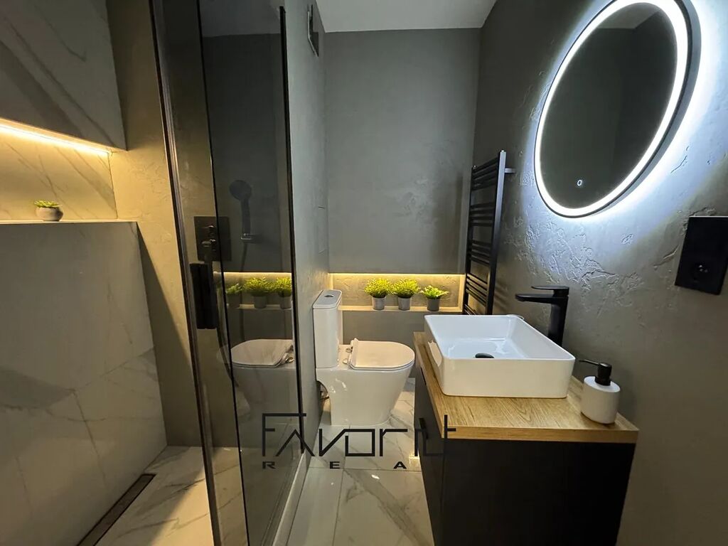 • Koupelna se sprchovým koutem, novými obklady, umyvadlem se skříňkou, podsvíceným zrcadlem a moderními bateriemi