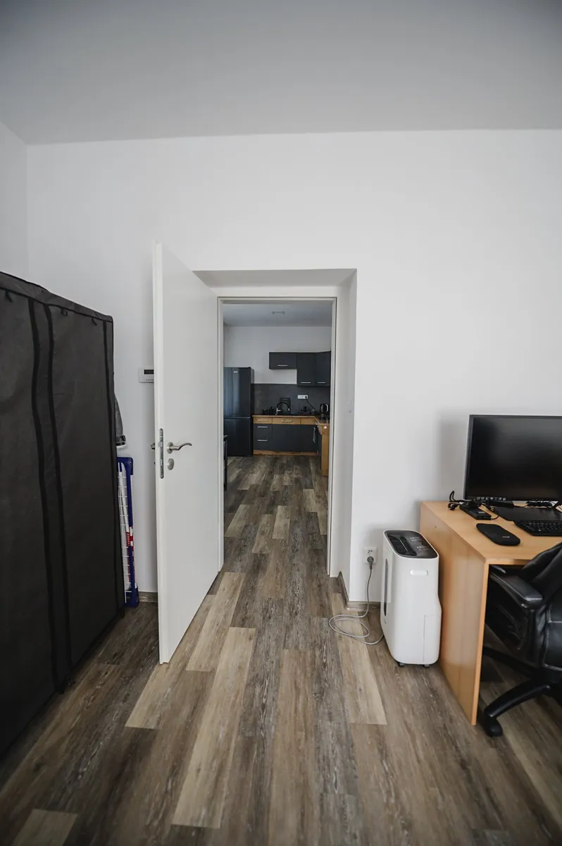 Výměra bytu je cca 46m2 . Po vstupu do bytu je prostorná předsíň  se vstupy do  koupelny s WC a  kuchyně. V předsíni jsou na míru vyrobené  vestavěné skříně, kde je mimo úložného prostoru na oblečení  i místo na  elektrokotel, bojler na ohřev vody a místo na pračku. Koupelna má sprchový kout, umyvadlo a WC.   Dále je z předsíně vstup do kuchyně a za ni je velký pokoj se 2 okny.