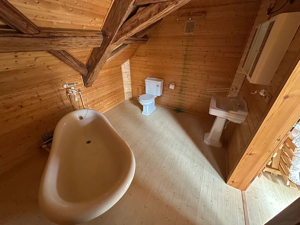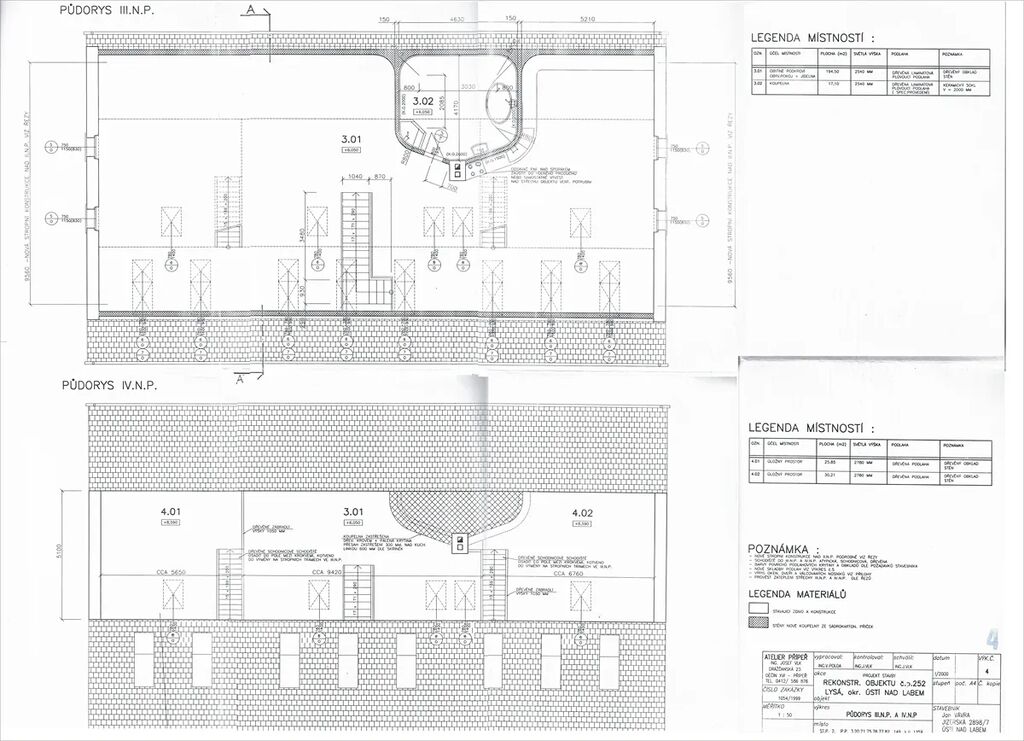 II.NP – schodiště, pokoj, pokoj, koupelna s WC, šatník, ložnice s vlastní koupelnou a WC, samostatný byt 1KK s předsíní a koupelnou s WC, velká místnost (herna), chodba, lodžie po celé délce domu. Z lodžie je možný vstup do vedlejší stodoly (garáž) s podkrovní hernou (pánský klub) a venkovním posezením s krbem.