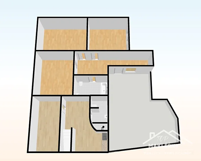 - bytová jednotka, která sestává v přízemí: z chodby, obývacího pokoje, kuchyně a jídelny, koupelny s prádelnou a WC. V podkroví, které je přístupné po točitém schodišti z jídelny jsou situované tři místnosti, koupelna s toaletou a vstup na terasu;