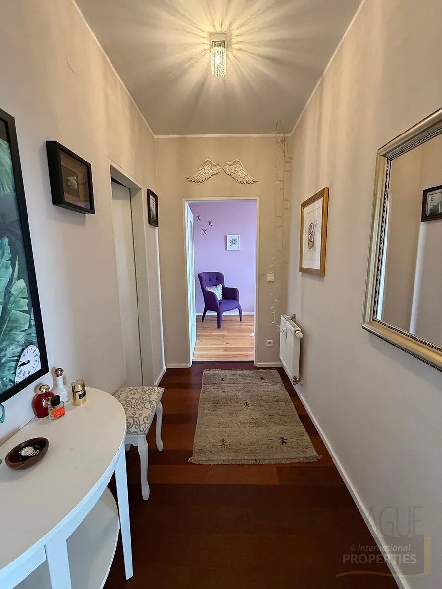 Kvalitní dřevěné podlahy – v obývací části Wenge, v ložnicích smrkové dřevo. V předsíni vestavěný nábytek na míru. Při rychlém jednání je možné ponechat kompletní vybavení bytu jako bonus.