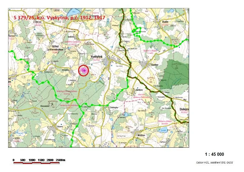Jedná se o lesní pozemky nepravidelného tvaru, které se nacházejí ne okraji lesního komplexu. Jsou obklopeny zemědělskými a lesními pozemky jiných vlastníků, přístupné pouze sezóně přes zemědělské pozemky. Na pozemku p.č. 1912 se nachází mýtní, převážně bukový porost – zakm. 8, na menší části 36-letý smrkový porost. Na pozemku p.č. 1917 se nachází smíšený 110-letý porost (SM, MD, BR – zakm. 4).