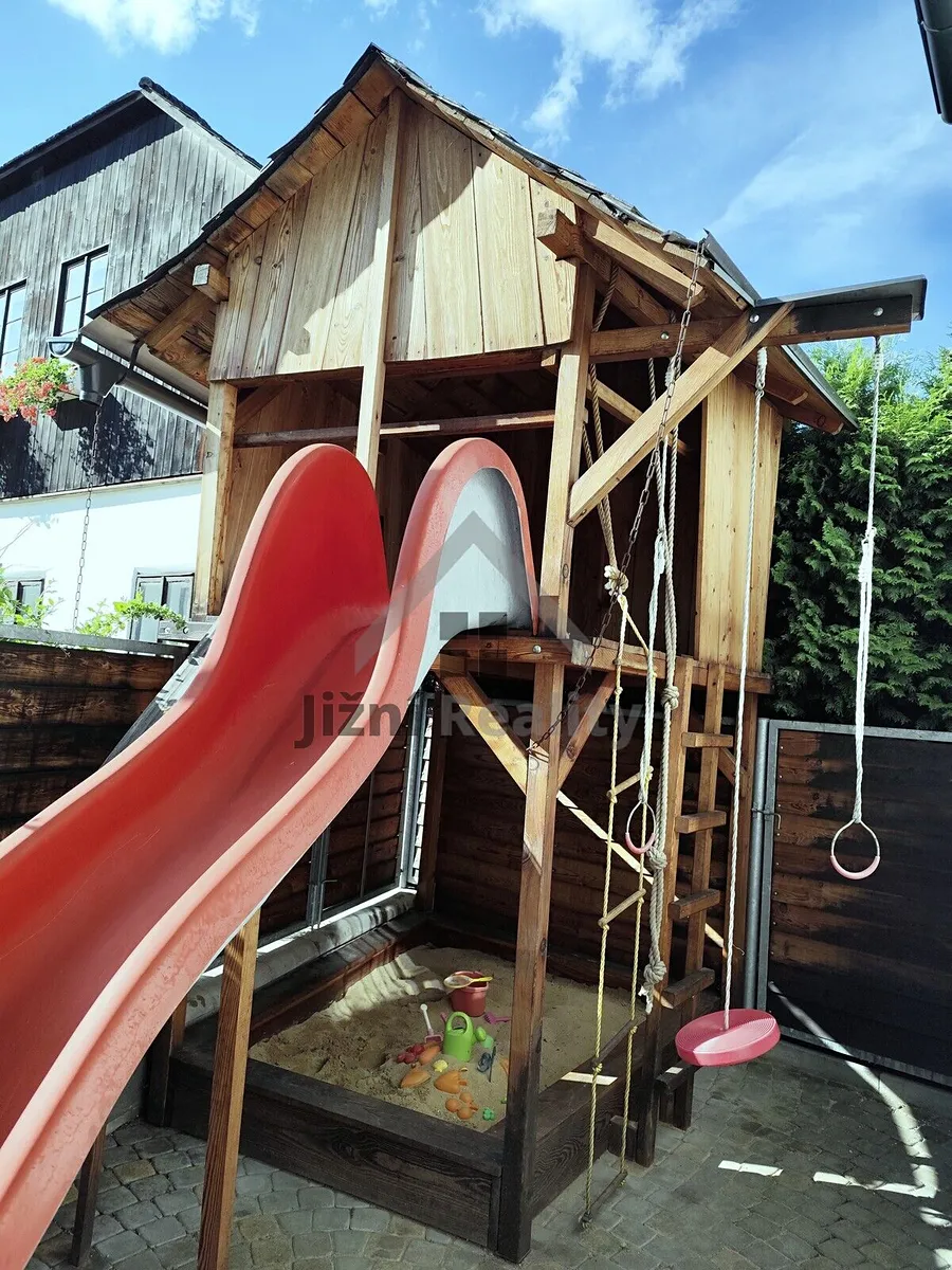 Nabízíme Vám k prodeji krásný rodinný dům o velikosti 5+2, který se nachází atraktivní lokalitě a naprosto krásném prostředí v obci Čkyně. Dům se nachází na vlastním pozemku o velikosti 228 m2, zastavěná plocha domu 120 m2, užitná 170 m2. Dům se skládá z bytové jednotky 2+1 + podkroví 1+1 + špička podkroví (20 m²) a garsoniéra. Nádvoří 99 m² s vjezdem pod pergoly 11 m². Dům je nízkonákladový, zateplený, ideální pro rodinu s 2-3 dětmi. Celý dům vytápí nová kuchyňská kamna (vaření + trouba) na dřevo s výměníkem (celkový výkon 32 kW) nebo plynový kotel. Čerpadlo jištěno novým záložním zdrojem. Střecha nově přepláštěna (3 roky) Capacco-rybí šupina s dvěma andulami (Al plech Prefa antracit) včetně okapů. Přízemí domu má dva bezbariérové vstupy. Samostatný vstup do garsoniéry (1+kk s patrem na spaní) + wellness s rohovou vanou, saunou a WC (stavebně připraveno). Pod pergolami dvě krytá stání. Vnitřní vybavení lze dle dohody odkoupit. Možnost odkupu vzrostlé zahrady (344 m² + 18 m²) nad ČD s pergolou 21 m² a skleníkem za 750.000,- Kč. V okolí domu se nachází veškerá občanská vybavenost, školka, škola, obecní úřad, obchody, restaurace atp. V případě jakýchkoliv Vašich dotazů mne neváhejte kontaktovat.