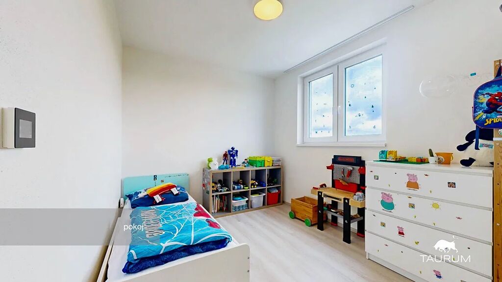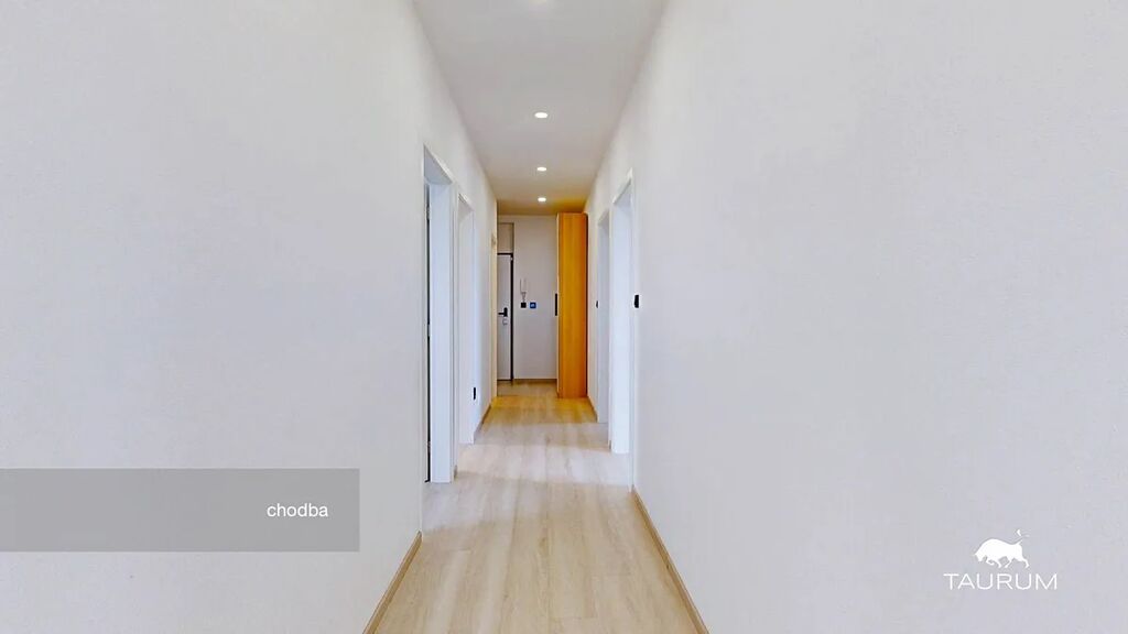 Byt je umístěný v 1. patře cihlové novostavby. Jeho dispozice je 4+kk, je skvěle dispozičně řešený. Po vstupu do bytu se nacházíme v dlouhé a prostorné chodbě, odkud vede vstup do komory, na samostatné WC, koupelny se sprchovým koutem a dvěma umyvadly, 3 samostatných pokojů a obývacího pokoje s kuchyňským koutem. Odtud se pak dostaneme na velikou terasu.