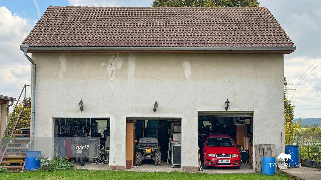 Vedle domu stojí stavba se 3 garážemi s elektrickými vraty a podkrovním prostorem. Tato budova ovšem vykazuje známky poškození. Je tedy možné ji buď opravit a zvětšit, nebo zdemolovat a místo ní postavit novou budovu (sklad, kanceláře, garáže...). STAVEBNÍ POVOLENÍ JE VYDANÉ na budovu o rozměru 11x24 m a do budovy jsou přivedeny přípojky (voda, elektřina, odpad a trubka pro připojení plynu). Současný majitel měl v plánu tuto budovu přestavět na velkou skladovací halu.