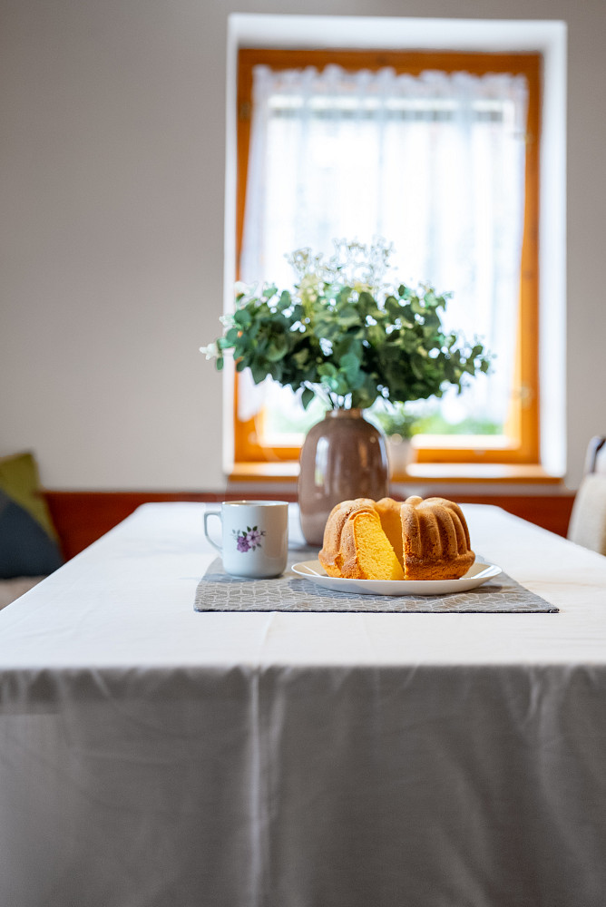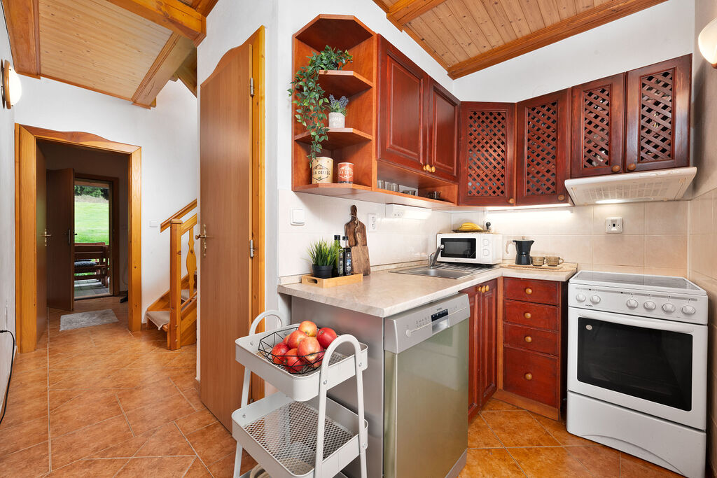 V přízemí dvoulůžkový pokoj + WC. V patře dva pokoje – jeden třílůžkový, druhý čtyřlůžkový – každý s vlastní sprchou a WC. Komfortní uspořádání nejen pro rodinu, ale i pro skupiny hostů.
