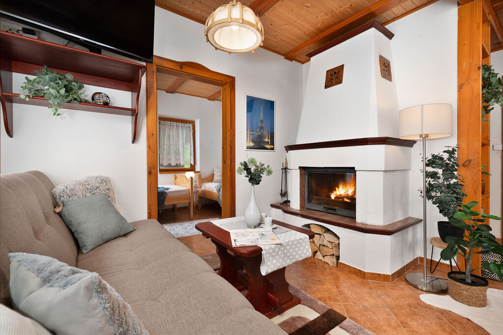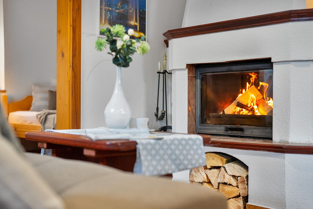 Klimatizace (v létě chladí, v zimě topí) a krb s rozvody tepla do pokojů – celoroční komfort bez kompromisů.