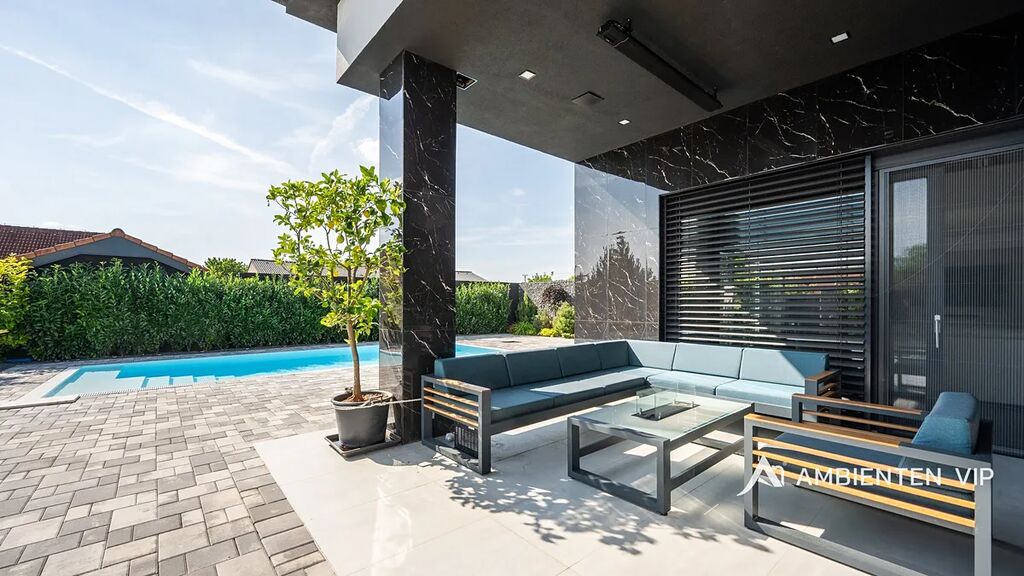 Pro rodinný dům je k dispozici také venkovní kuchyně, ke které náleží plynový gril. Předností je i soukromý bazén se slanou vodou o velikosti 8 × 4 metry. Dům je napojen na samostatné podružné měřidlo elektřiny a vody a jeho vytápění zajišťuje tepelné čerpadlo (vzduch/voda) a dva elektrické bojlery – samostatné pro vytápění a ohřev TUV. Dům má teplovodní podlahové vytápění. Celý prostor lze zakódovat pomocí zabezpečovacího systému Jablotron a chráněn je také kamerovým dohledem.