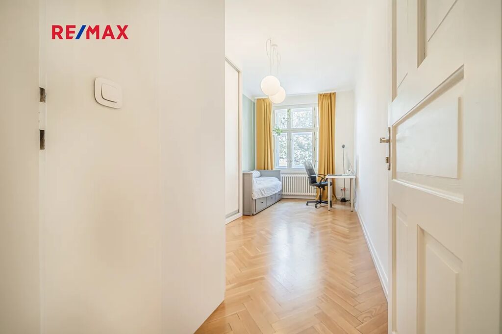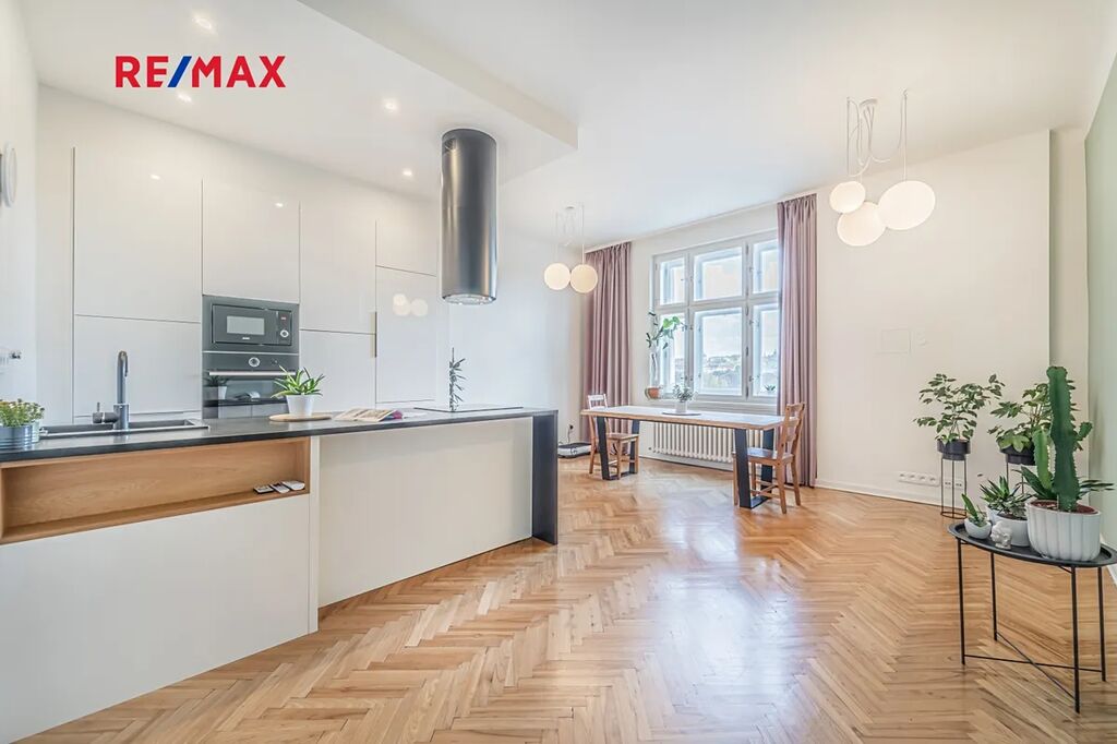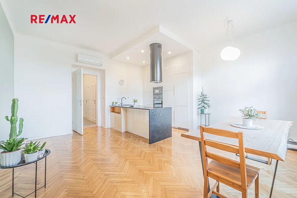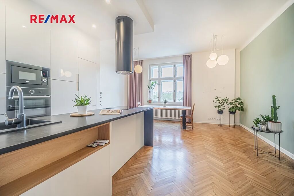 Bytová jednotka v osobním vlastnictví prošla v r. 2018 kompletní, ale velmi citlivou rekonstrukcí s důrazem na zachování ducha nemovitosti a zároveň na propojení původních prvků s moderním bydlením. Renovace dřevěných parketových podlah, interiérových dveří s obložkovými zárubněmi z masivního dřeva, nová avšak dobová dřevěná špaletová okna včetně kování s izolačním trojsklem - vše doplněno moderní kuchyňskou linkou s vestavnými spotřebiči, luxusní koupelnou či klimatizací. Obývací pokoj s kuchyní je orientován na východ s výhledem na Vltavu a Vyšehrad. Okna ložnic pak na západ, do vnitrobloku. Na první pohled Vás zaujme mnoho na míru zhotovených úložných prostor v podobně vestavných skříní, polic a šatníku, včetně průchozí šatny v ložnici. Velkou výhodou je uzavíratelná komora s regálovým systémem, kde je umístěna pračka a sušička. Technická místnost s plynovým kotlem, jenž představuje vlastní zdroj topení a ohřevu TUV je zcela oddělena.