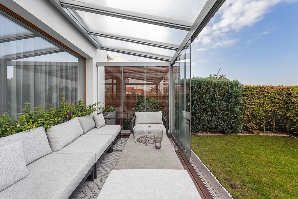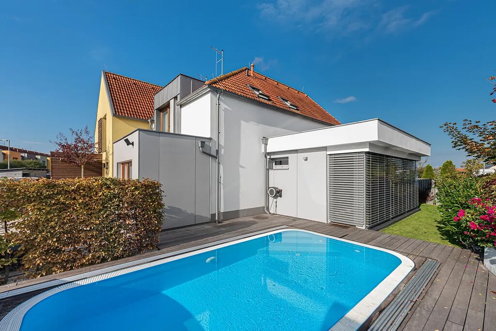 Nadstandardní rodinný dům o dispozici 7+kk a užitné ploše 167 m² se nachází v klidné rezidenční části obce Drahelčice, pouhých několik minut od Prahy. Nemovitost nabízí harmonické propojení moderní architektury, precizního zpracování a komfortu rodinného bydlení s důrazem na detail, funkčnost i estetiku. Dominantou přízemí je světlý obývací pokoj s krbem a kuchyní vybavenou spotřebiči Miele a vinotékou, plynule navazující na zimní zahradu a společenskou místnost s celoskleněnými stěnami, které otevírají interiér do pečlivě udržované zahrady. Součástí přízemí je dále vstupní hala s šatnou a vestavěnými skříněmi, toaleta, ložnice a samostatná prádelna. Elegantní dřevěné schodiště s nerezovým zábradlím vede do patra, kde se nachází hlavní ložnice s vlastní koupelnou, dva dětské pokoje a druhá koupelna s vanou a dvojumyvadlem. K vysokému standardu vybavení patří dřevěné podlahy v dekoru šedého dubu, bezfalcové dveře v bílém laku, hliníková a plastová okna s trojsklem, designové koupelny s italskou keramikou a sanitou Hansgrohe, venkovní žaluzie a vytápění kombinující podlahové topení, konvektory a radiátory s plynovým kotlem. Komfortní zázemí této výjimečné nemovitosti doplňují venkovní terasy z exotického dřeva massaranduba, vyhřívaný bazén se slanou vodou (8×4 m) s protiproudem a zastřešením, elektricky ovládaná posuvná brána, zahradní domek a dvě venkovní parkovací stání na zpevněné ploše před domem. Pečlivě udržovaná zahrada nabízí maximální soukromí, klid a příjemné posezení. Drahelčice jsou oblíbenou rezidenční lokalitou s rychlým spojením do Prahy a plnou občanskou vybaveností. V blízkosti se nachází mateřská a základní škola, sportoviště, restaurace, dětská hřiště i přírodní okolí vhodné pro rekreaci. Do centra Prahy se pohodlně dostanete autem do 20 minut nebo MHD – zastávka je v docházkové vzdálenosti.