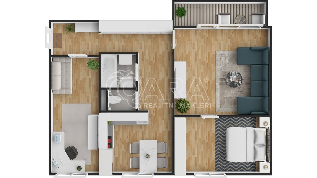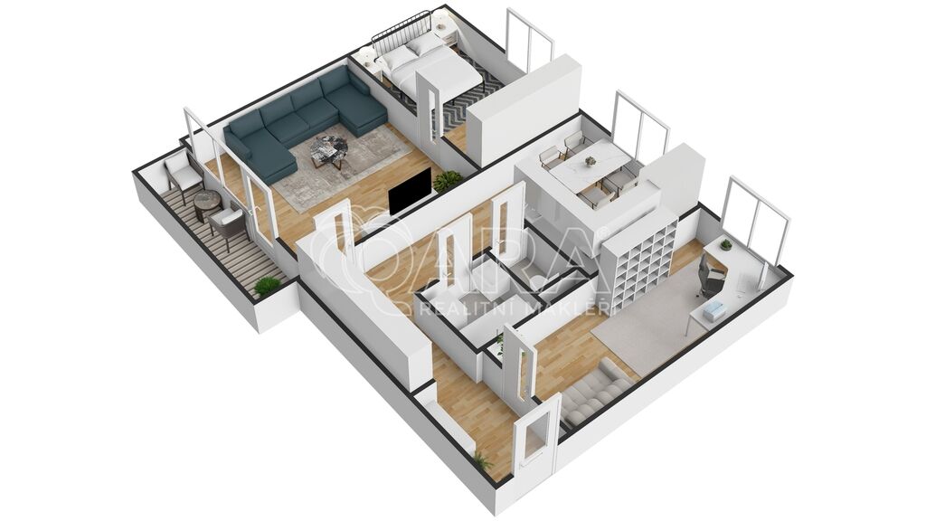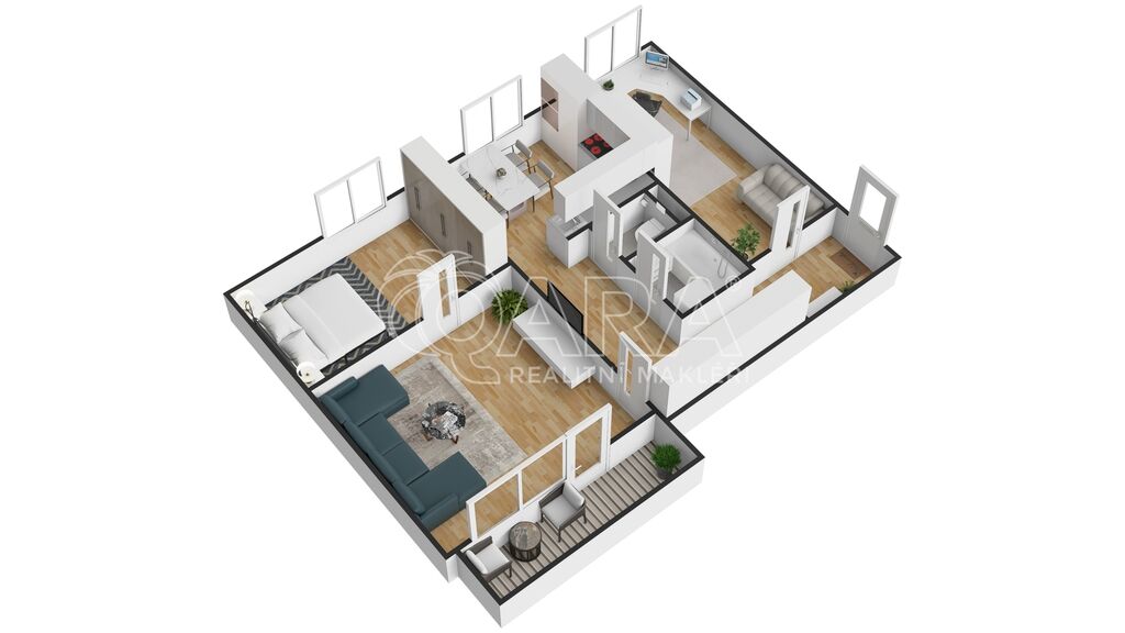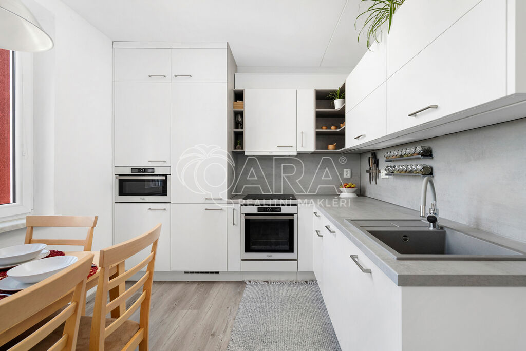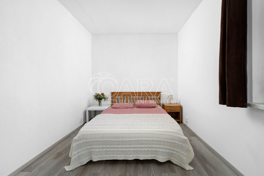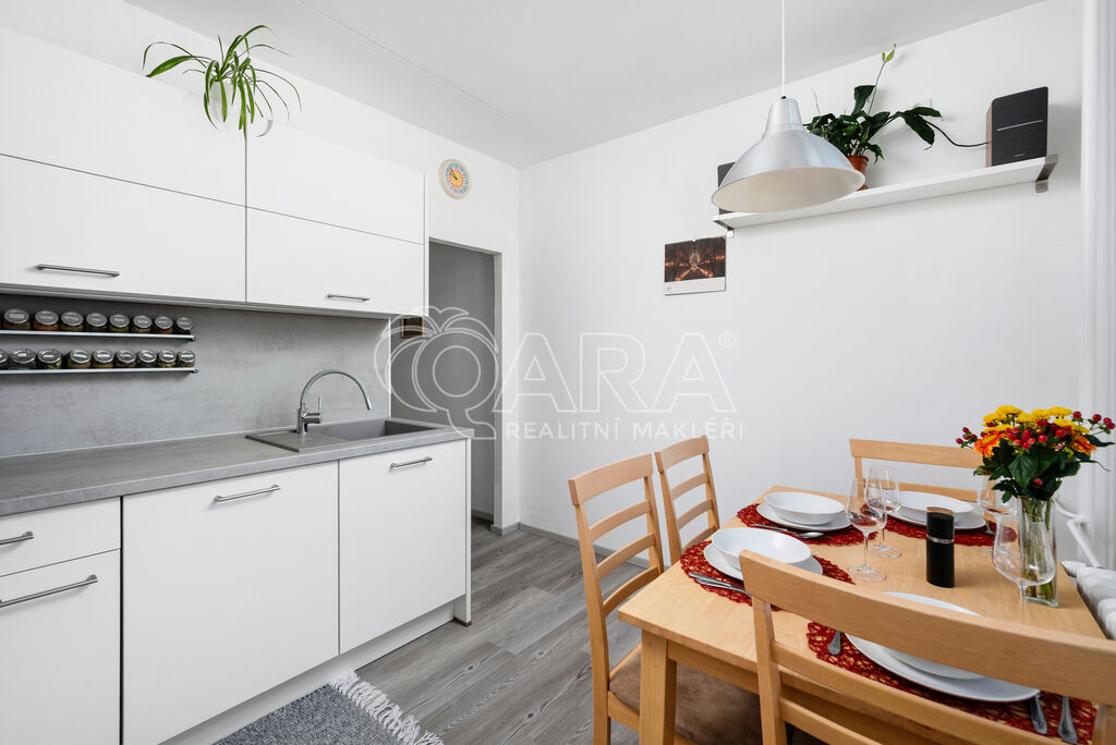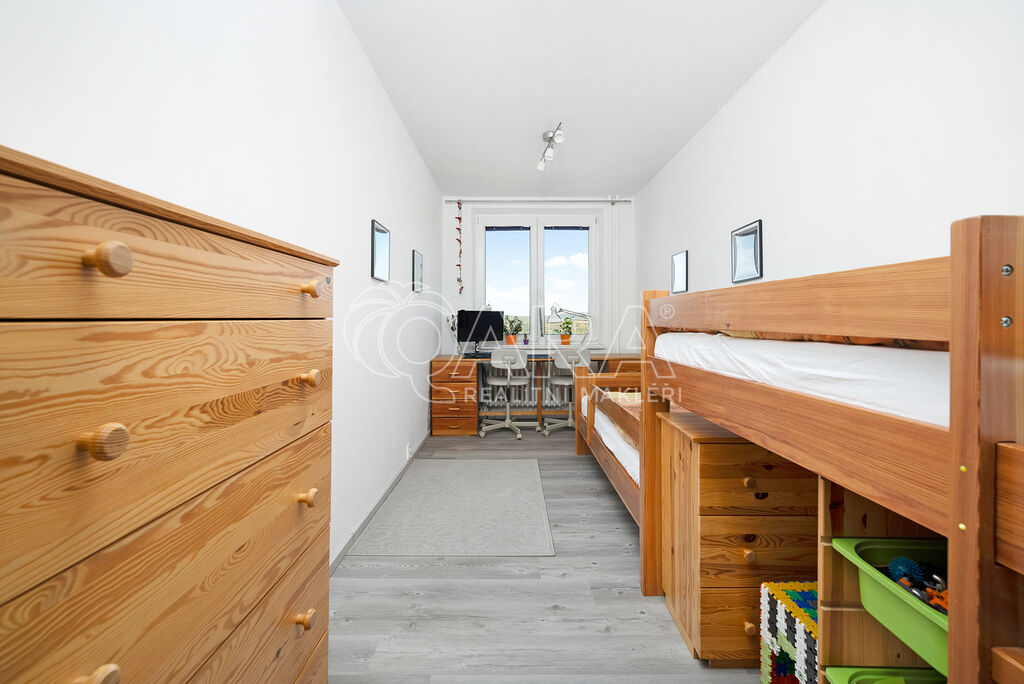 Byt disponuje třemi pokoji o velikostech 19, 15 a 12 m², což zajišťuje maximální soukromí a prostor pro každého člena rodiny. Kuchyně o velikosti 10 m2 je vybavena moderní kuchyňskou linkou s vestavnými značkovými spotřebiči značky Whirpool. Jádro je zděné, koupelna disponuje vanou, WC je samostatně.