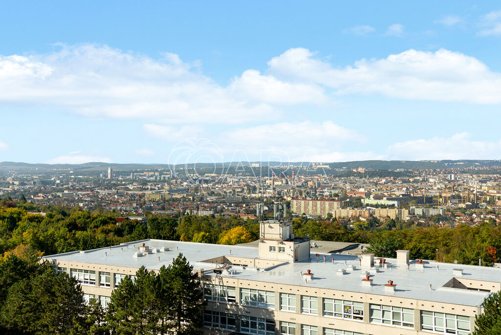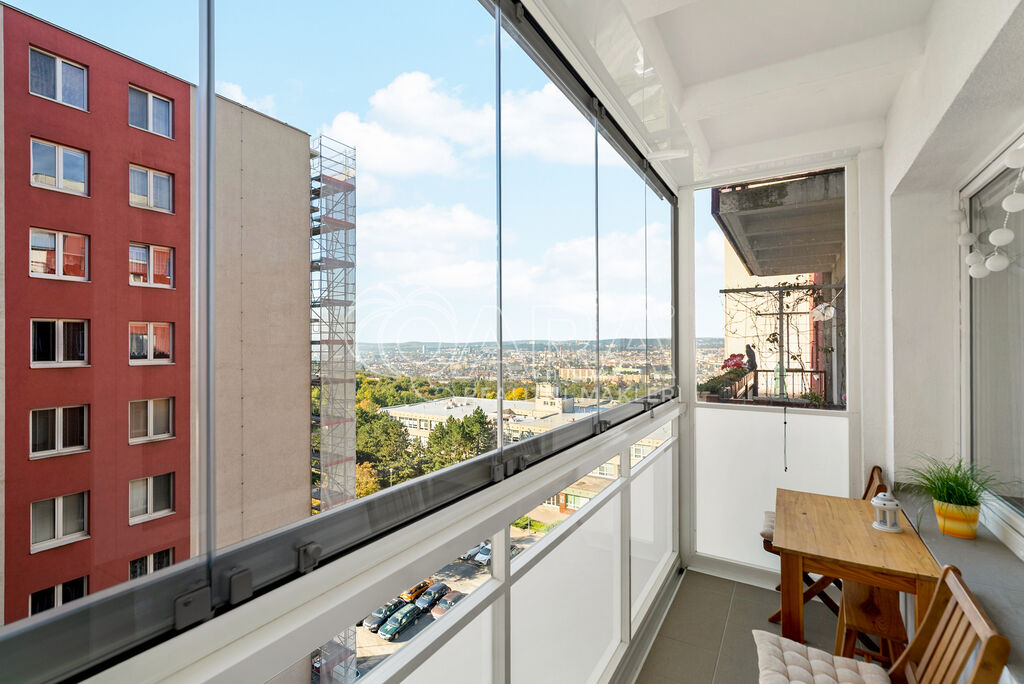 Součástí bytu je zasklený balkon s úžasným výhledem na Brno a do okolí, o velikosti 5 m², který je ideální pro posezení a odpočinek s čajem či kávou.