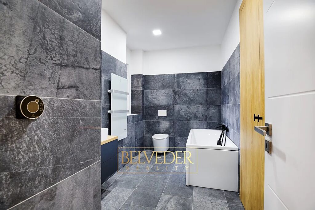 Interiér je vybaven podlahovým vytápěním s vlastním termostatem v každé místnosti, kvalitními laminátovými podlahami a moderní kuchyňskou linkou s vestavěnými spotřebiči, včetně horkovzdušné trouby, mikrovlnné trouby a vestavěné lednice; nechybí ani prostorná koupelna s vanou.