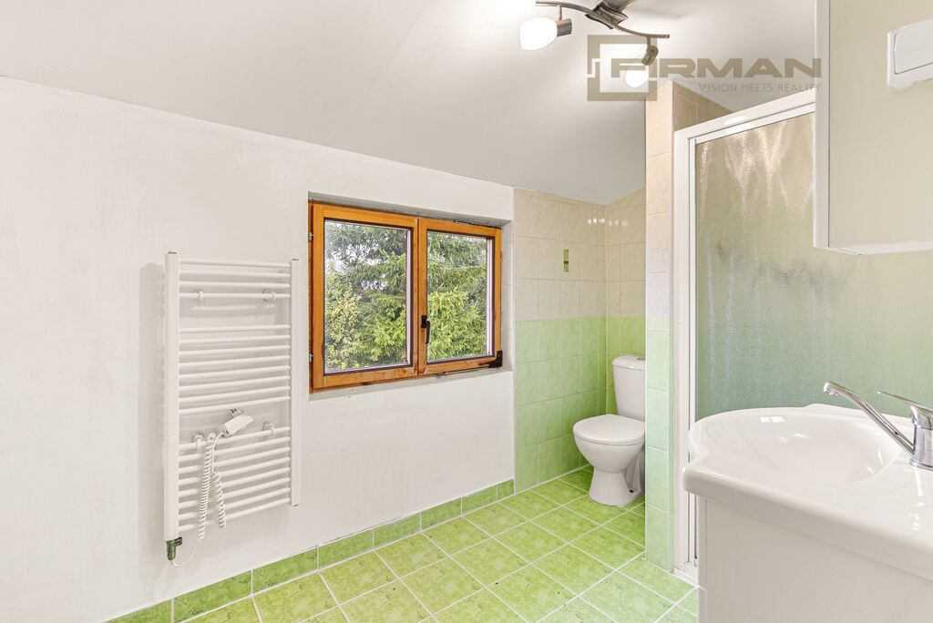 Současná koupelna v přízemí je v původním stavu a bude vyžadovat rekonstrukci. Dům je však obyvatelný, ve spodním patře se doposud trvale bydlelo.