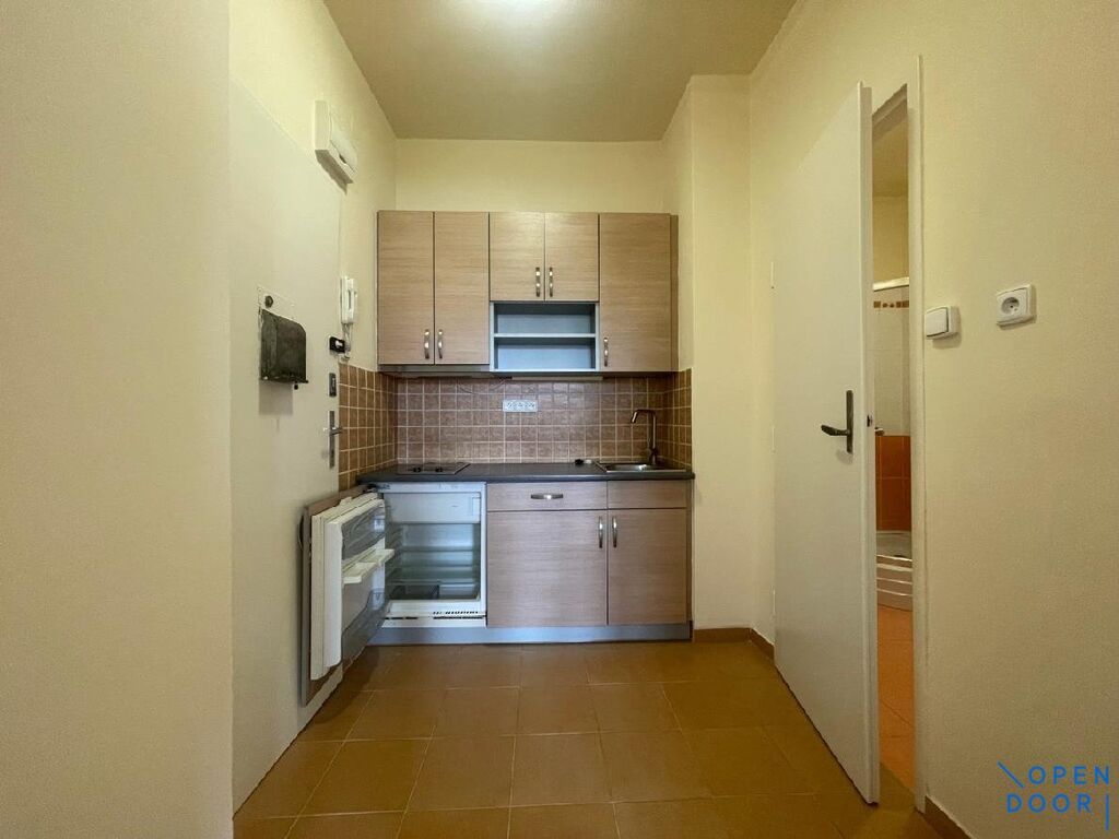 Prostorný pokoj s parketovou podlahou a s výhledem do klidného vnitrobloku je vybaven velkou šatní skříní, v předsíni je instalována kuchyňská linka s lednicí a dvou plotýnkovou elektrickou varnou deskou. Koupelna je se sprchovým koutem, má přípojku na pračku a úložné skříňky. WC v koupelně.