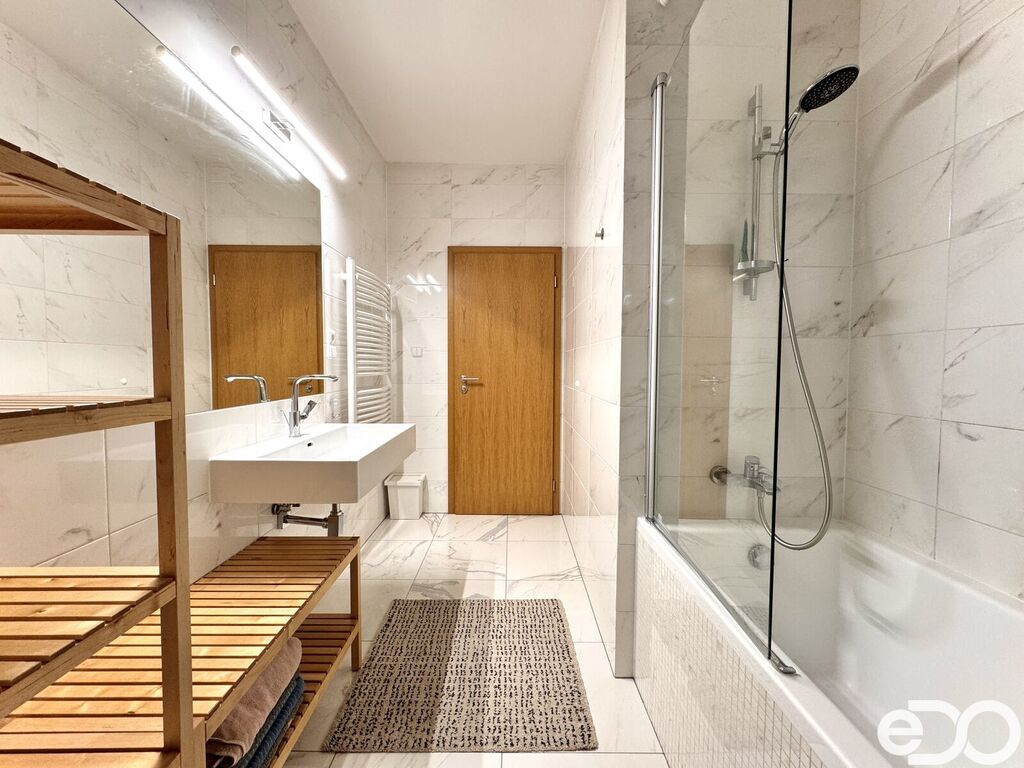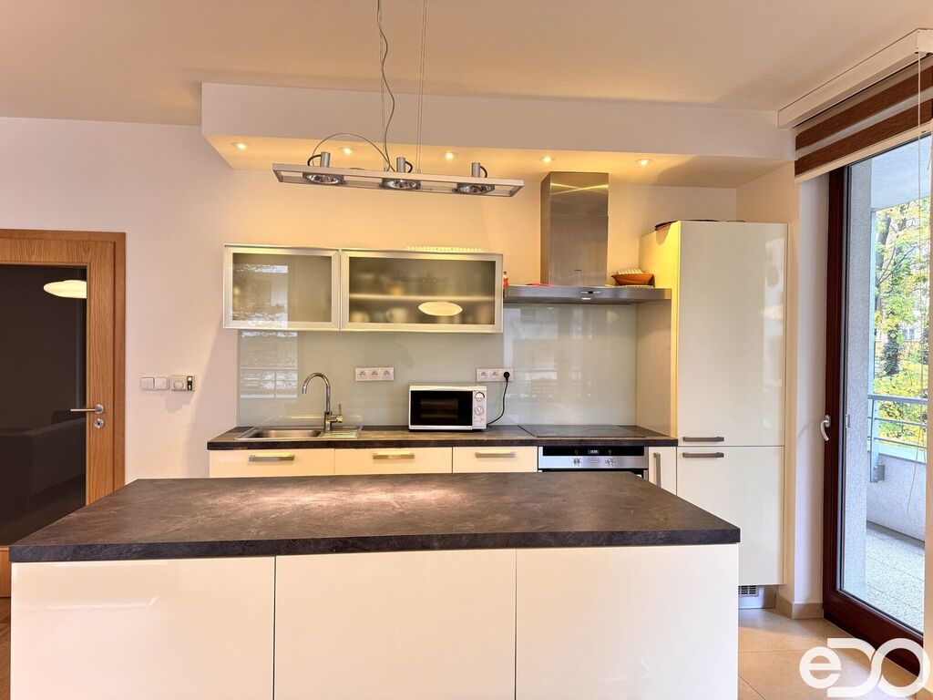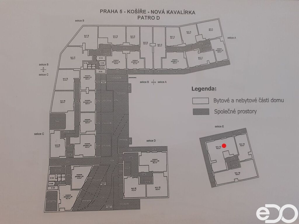 Nabízíme pronájem prostorného bytu 3+kk s užitnou plochou 85 m2 a velkou lodžií s plochou 38 m2, která je přístupná ze všech pokojů. Byt je v novější zástavbě v projektu Pod Kavalírkou v Praze – Košířích. Bytový dům byl vystavený před 11 lety. Byt je vybavený následujícím nábytkem – obývací pokoj: gauč, stolek pod TV, TV, knihovna, jídelní stůl se 4 židlemi, v menším pokoji: postel a komoda, v koupelně: pračka a police, ve větším pokoji: postel, malá komoda, věšák a větší komoda. Lze pronajmout i garážové stání za částku výše. Výměry jsou orientační.